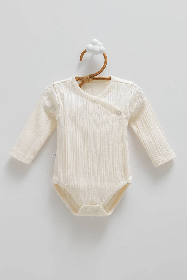 Боди выполнен в светлом, кремовом оттенке, что придает изделию универсальность и мягкость визуального восприятия. Материал выглядит натуральным и приятным на ощупь, с выраженной рельефной фактурой в виде вертикальных полос, что добавляет интересный акцент в дизайне. Длинные рукава обеспечивают дополнительный комфорт и защиту в прохладную погоду. Конструкция предусматривает запах на одну сторону с застежкой на кнопки, что облегчает процесс одевания и снятия, делая изделие особенно удобным для малышей. Края аккуратно обработаны, что говорит о качественном исполнении. Эластичная ткань позволяет сохранять форму и обеспечивает свободу движений. Дизайн лаконичный, без лишних декоративных элементов, что делает изделие подходящим для ежедневного использования. Универсальный стиль позволяет сочетать боди с различной одеждой, создавая комфортный образ на каждый день. Изделие подходит для детей благодаря мягкости ткани и отсутствию раздражающих деталей.
