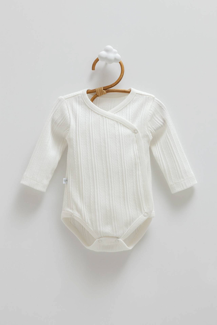 Боди выполнен в светлом, кремовом оттенке, что придает изделию универсальность и мягкость визуального восприятия. Материал выглядит натуральным и приятным на ощупь, с выраженной рельефной фактурой в виде вертикальных полос, что добавляет интересный акцент в дизайне. Длинные рукава обеспечивают дополнительный комфорт и защиту в прохладную погоду. Конструкция предусматривает запах на одну сторону с застежкой на кнопки, что облегчает процесс одевания и снятия, делая изделие особенно удобным для малышей. Края аккуратно обработаны, что говорит о качественном исполнении. Эластичная ткань позволяет сохранять форму и обеспечивает свободу движений. Дизайн лаконичный, без лишних декоративных элементов, что делает изделие подходящим для ежедневного использования. Универсальный стиль позволяет сочетать боди с различной одеждой, создавая комфортный образ на каждый день. Изделие подходит для детей благодаря мягкости ткани и отсутствию раздражающих деталей.