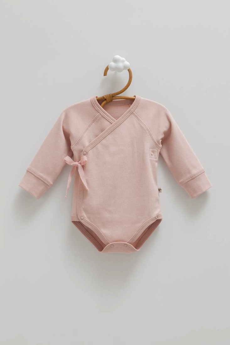 Боди выполнено в спокойном темно-розовом цвете, который придает изделию нежный и аккуратный вид. Материал визуально выглядит мягким и приятным на ощупь, что особенно важно для чувствительной детской кожи. Длинные рукава обеспечивают дополнительную защиту от холода, а манжеты на концах рукавов делают посадку более удобной и предотвращают задирание ткани. Боди имеет кроющий запах, фиксирующийся на боковой завязке, что облегчает процесс переодевания и обеспечивает комфортное прилегание по фигуре малыша. Дизайн отличается лаконичностью и отсутствием лишних деталей, что делает изделие универсальным для повседневного использования. Классическая застежка на кнопках в нижней части позволяет быстро сменить подгузник без необходимости полностью снимать одежду. Визуально ткань выглядит плотной и эластичной, что обеспечивает удобство движений и сохранение формы после стирки. Мягкие швы аккуратно обработаны, не вызывают дискомфорта и натирания.