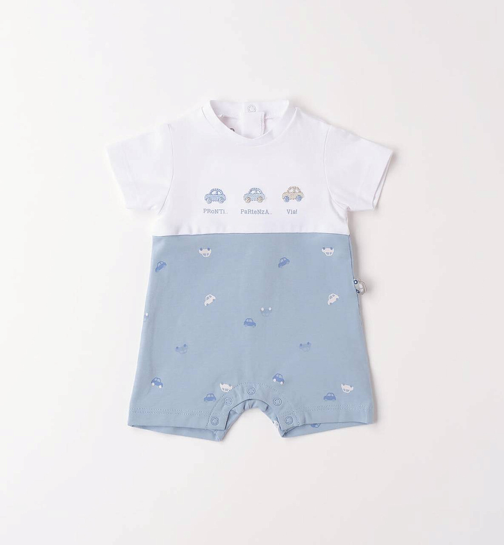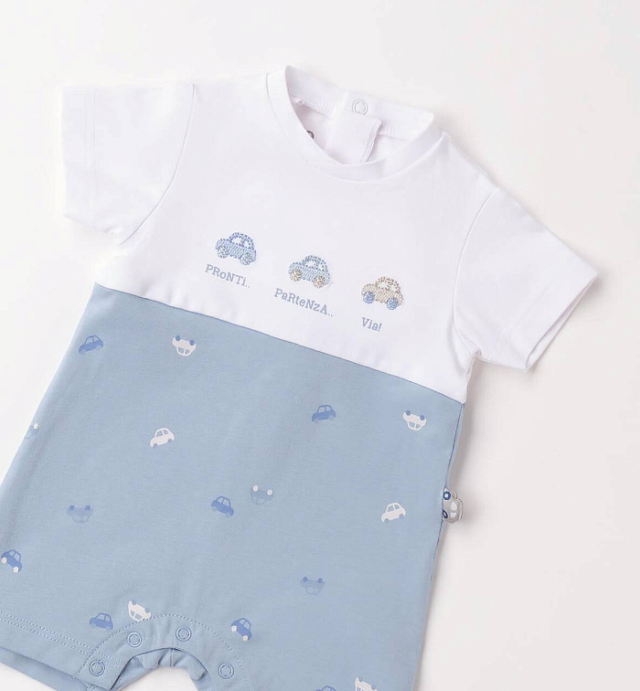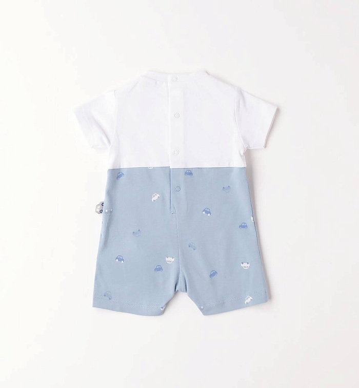 Милый комбинезон iDO для детей из эластичного хлопкового джерси. Вышивка спереди и принт с игрушечными машинками по всей поверхности. На спине и между ножек есть кнопки для удобства переодевания.