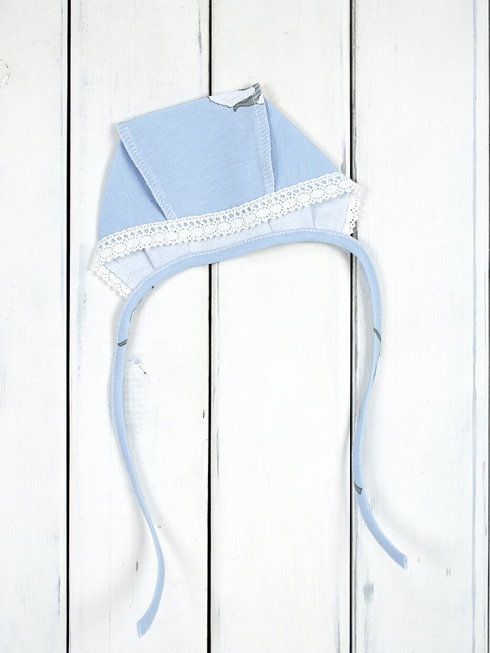 Чепчик из интерлока, по переду отделан хлопковым вязанным кружевом.