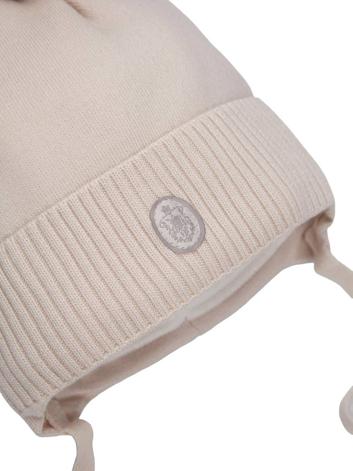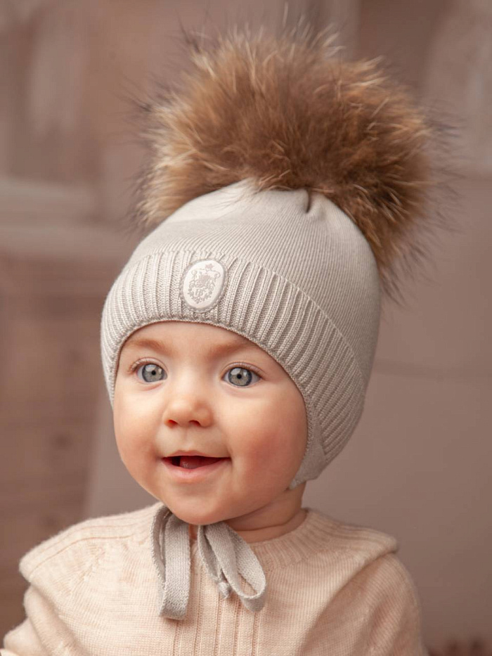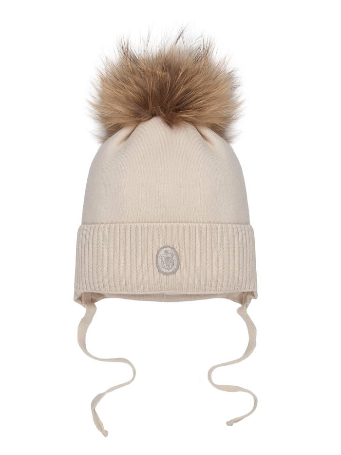Шапка зимняя с утеплителем с меховым помпоном на завязках, цв. бежевый