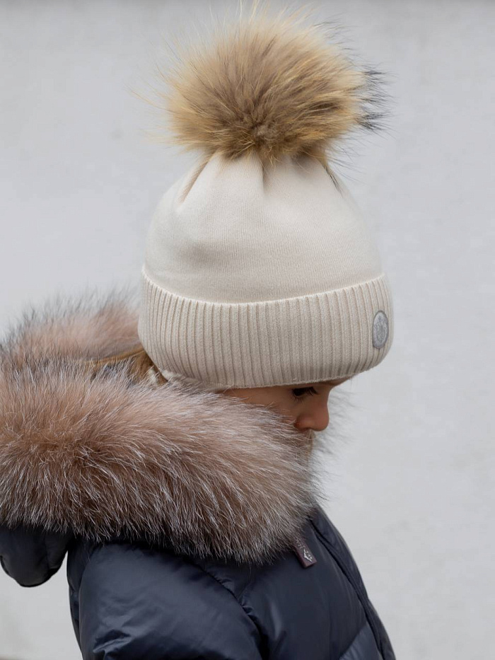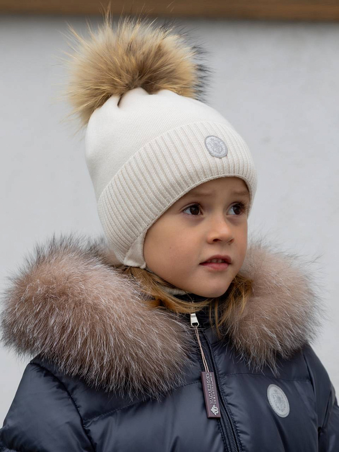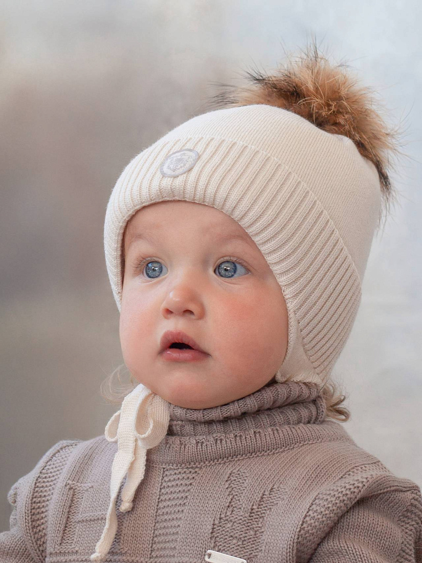 Вязаная шерстяная шапка - незаменимый головной убор для детей в зимнее время года. Удобные завязки и дополнительные изгибы на ушках позволяют шапочке плотно сидеть на голове, не сползать на глаза и хорошо закрывать ушки, защищая от холода и ветра. Шапка изготовлена из шерсти мериноса с добавлением пана, имеет хлопковый подклад и утеплитель термофин. Изделие дополнено большим помпоном из натурального меха песца.