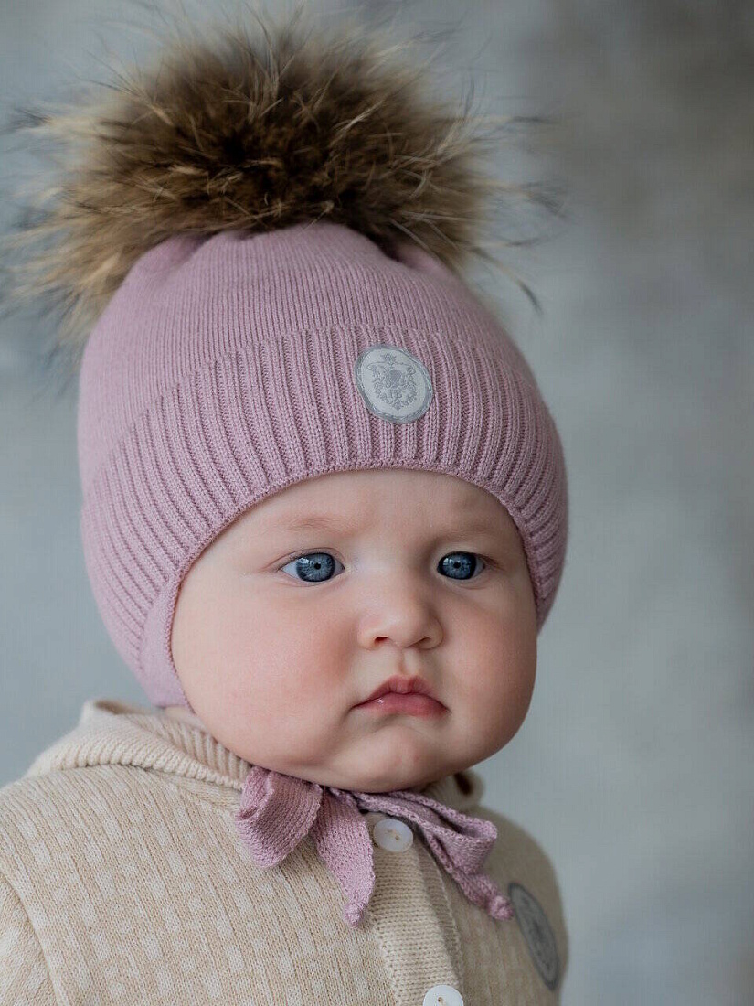 Шапка зимняя с утеплителем с меховым помпоном на завязках, цв. пудра, р. 38-40