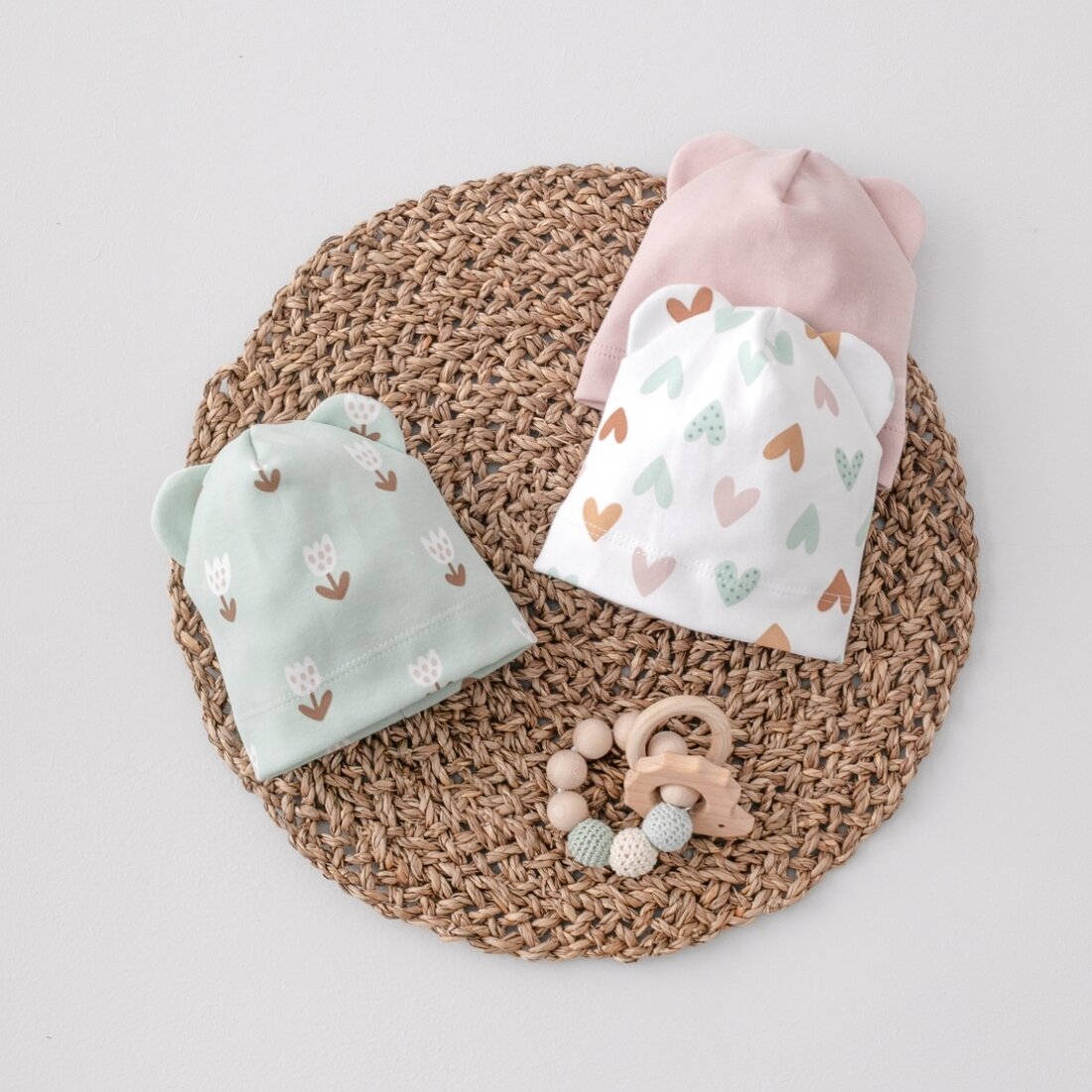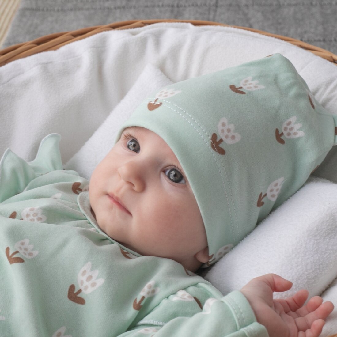Шапочка отворотом и ушками "Первые Цветы", р. 3-6 мес.