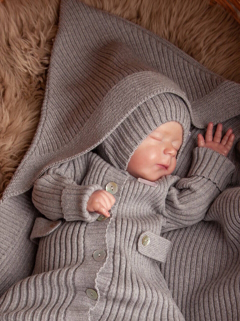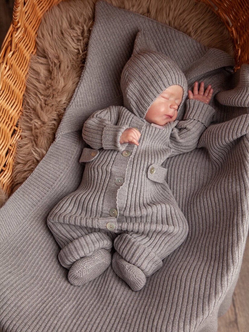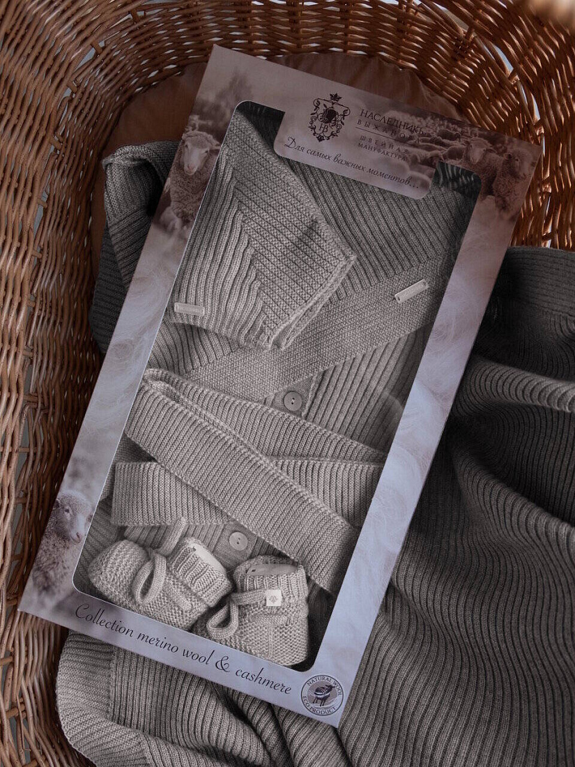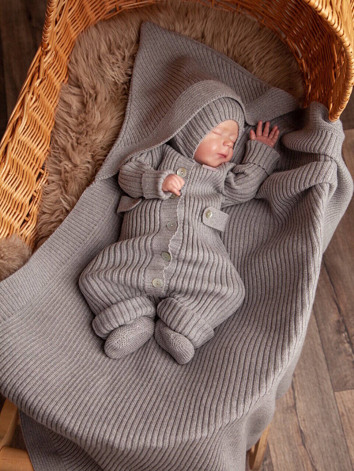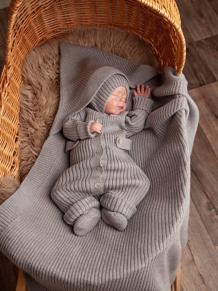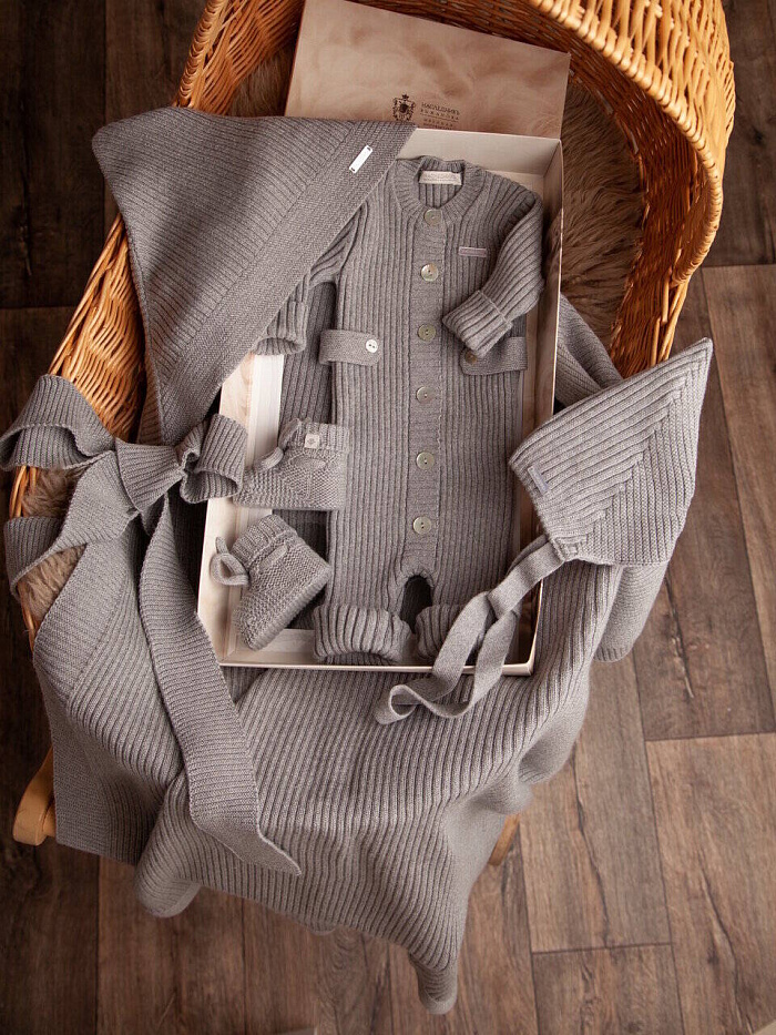 Состав комплекта: плед с капюшоном, комбинезон, шапочка, пинетки, фирменная упаковка.