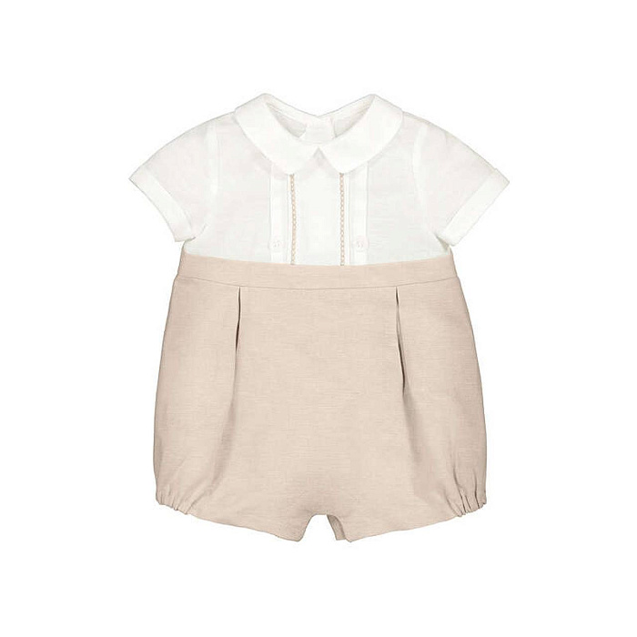 Полукомбинезон для мальчика выполнен в элегантном и лаконичном стиле, что делает его отличным выбором для различных поводов. Верхняя часть изделия представляет собой имитацию рубашки с коротким рукавом, выполненной из светлого материала, визуально напоминающего хлопок. Воротник классический, отложной, с мягкими закругленными краями. По центру проходят декоративные планки с пуговицами, что добавляет образу аккуратности. Нижняя часть полукомбинезона выполнена из материала бежевого цвета, с легкой текстурой, напоминающей натуральную ткань. Дизайн изделия предусматривает свободную посадку и удобные резинки по низу штанин, что обеспечивает комфорт и свободу движений для мальчика. Передняя часть полукомбинезона украшена аккуратными складками, придающими дополнительный объем и стиль. Благодаря универсальному цвету и сдержанному дизайну, полукомбинезон отлично подойдет как для повседневной носки, так и для торжественных мероприятий.