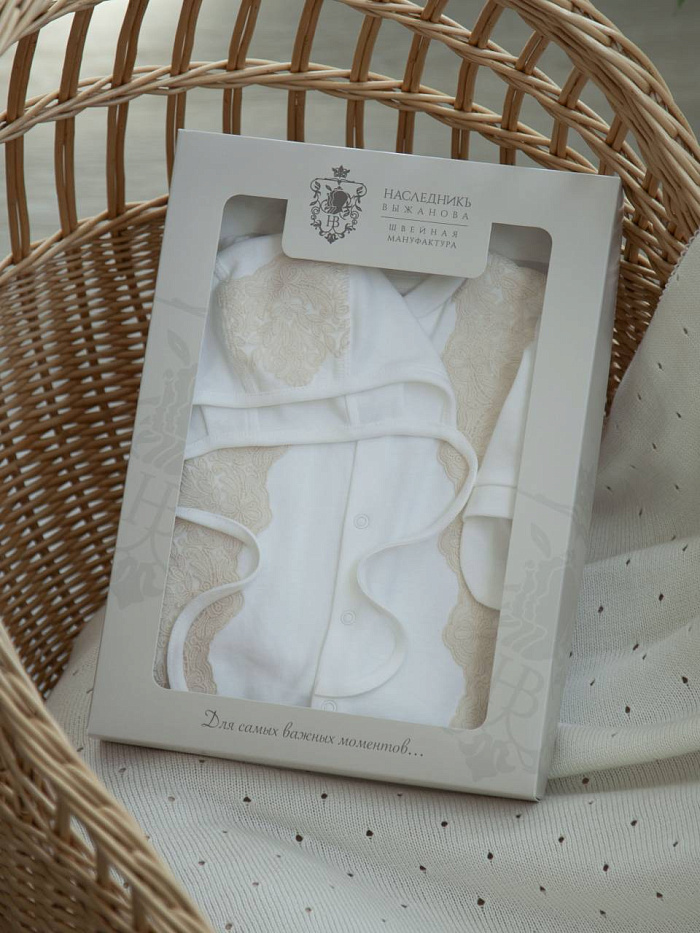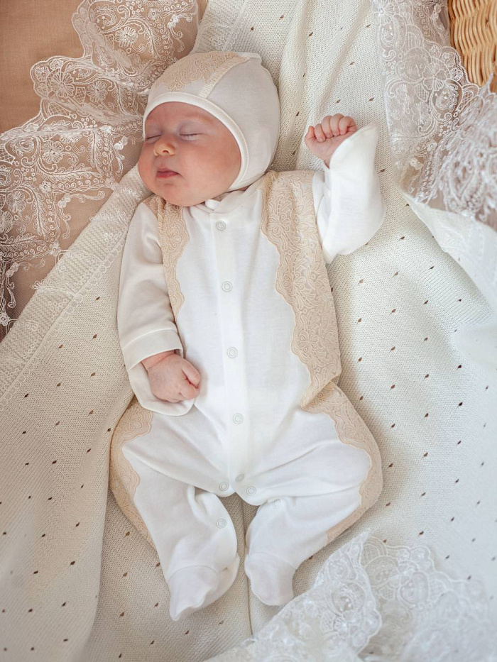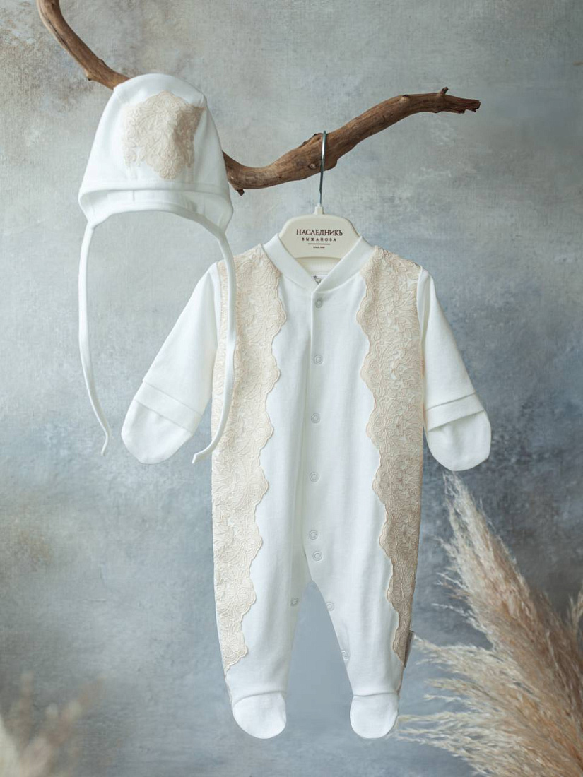 Невероятно нежный комплект на выписку. Комбинезон со встроеной юбочкой, декорирован стильной бежевой вышивкой и нежными атласными розочками. В комплект входит нарядный чепчик с вышивкой в тон.
