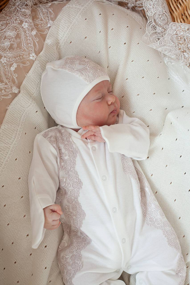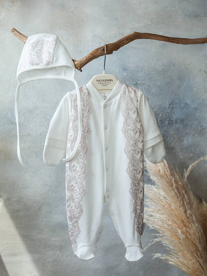 Невероятно нежный комплект на выписку. Комбинезон со встроеной юбочкой, декорирован стильной бежевой вышивкой и нежными атласными розочками. В комплект входит нарядный чепчик с вышивкой в тон.