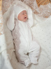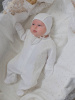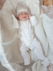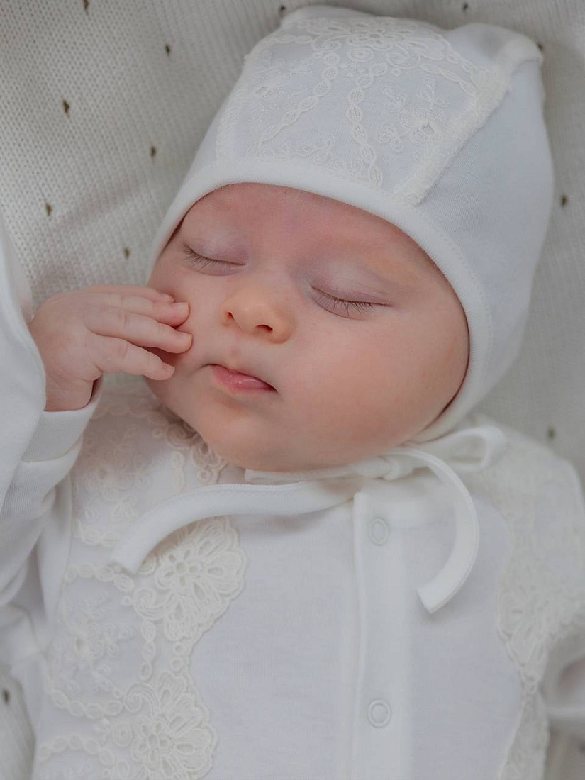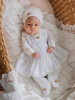 Невероятно нежный комплект на выписку. Комбинезон со встроеной юбочкой, декорирован стильной бежевой вышивкой и нежными атласными розочками. В комплект входит нарядный чепчик с вышивкой в тон.