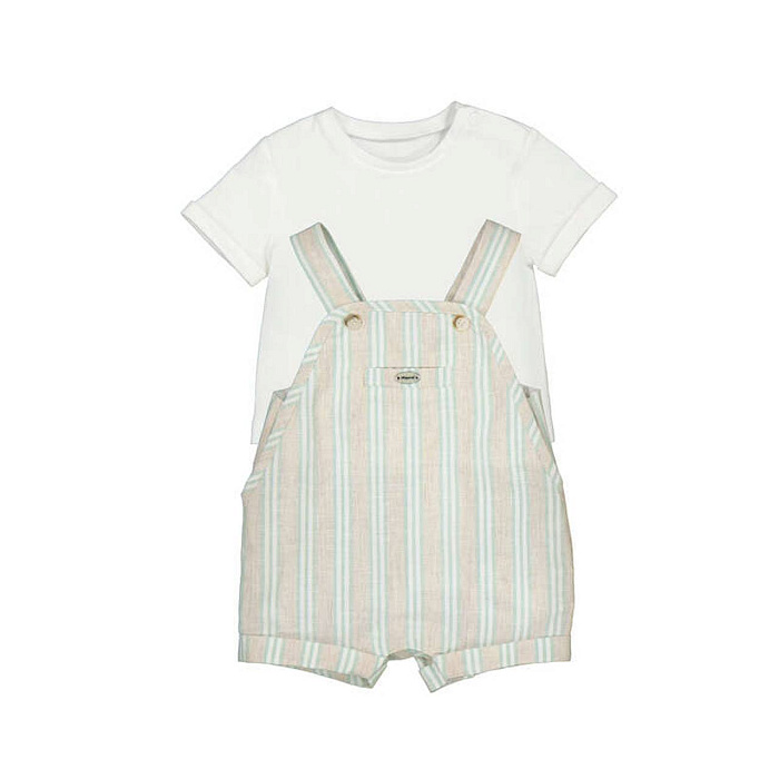 Футболка и полукомбинезон для мальчика — это удобный и стильный комплект, который отлично подойдет для ежедневных прогулок и активного отдыха. Футболка выполнена из мягкого материала светлого оттенка, что делает ее приятной к телу и позволяет коже дышать даже в жаркую погоду. Классический крой с короткими рукавами обеспечивает свободу движений и комфорт на протяжении всего дня. Полукомбинезон изготовлен из ткани натурального оттенка с вертикальным полосатым узором в мягких пастельных тонах, что придает образу легкость и свежесть. Удобные широкие лямки крепятся на пуговицы спереди, что облегчает процесс одевания и снятия изделия. На передней части полукомбинезона расположен карман, который добавляет функциональности и практичности. Ткань полукомбинезона имеет приятную на ощупь текстуру, хорошо держит форму и подходит для длительного ношения. Нейтральные цвета и лаконичный дизайн позволяют легко сочетать комплект с другой одеждой из гардероба мальчика.