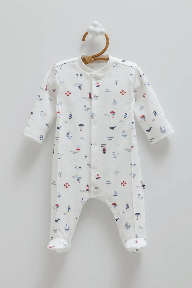 Комбинезон для мальчика выполнен из мягкого и приятного на ощупь материала, обеспечивающего комфорт в течение всего дня. Цвет изделия — нежный экрю с морским тематическим принтом: изображены маяки, кораблики, чайки, спасательные круги, зонтики и небольшие морские волны. Дизайн комбинезона гармонично сочетает спокойные оттенки синего, красного и серого, что делает его универсальным и стильным вариантом для повседневной носки и сна. Длинные рукава и закрытые ножки обеспечивают дополнительное тепло, а мягкая эластичная ткань хорошо садится по фигуре, не сковывая движения малыша. Конструкция предусматривает удобную застежку на кнопках по всей длине изделия, что облегчает процесс переодевания и смены подгузников. Круглый воротник аккуратно обработан, не натирает и не вызывает дискомфорта. Ткань дышащая, подходит для чувствительной кожи. Приятная текстура материала делает комбинезон подходящим даже для самых маленьких.