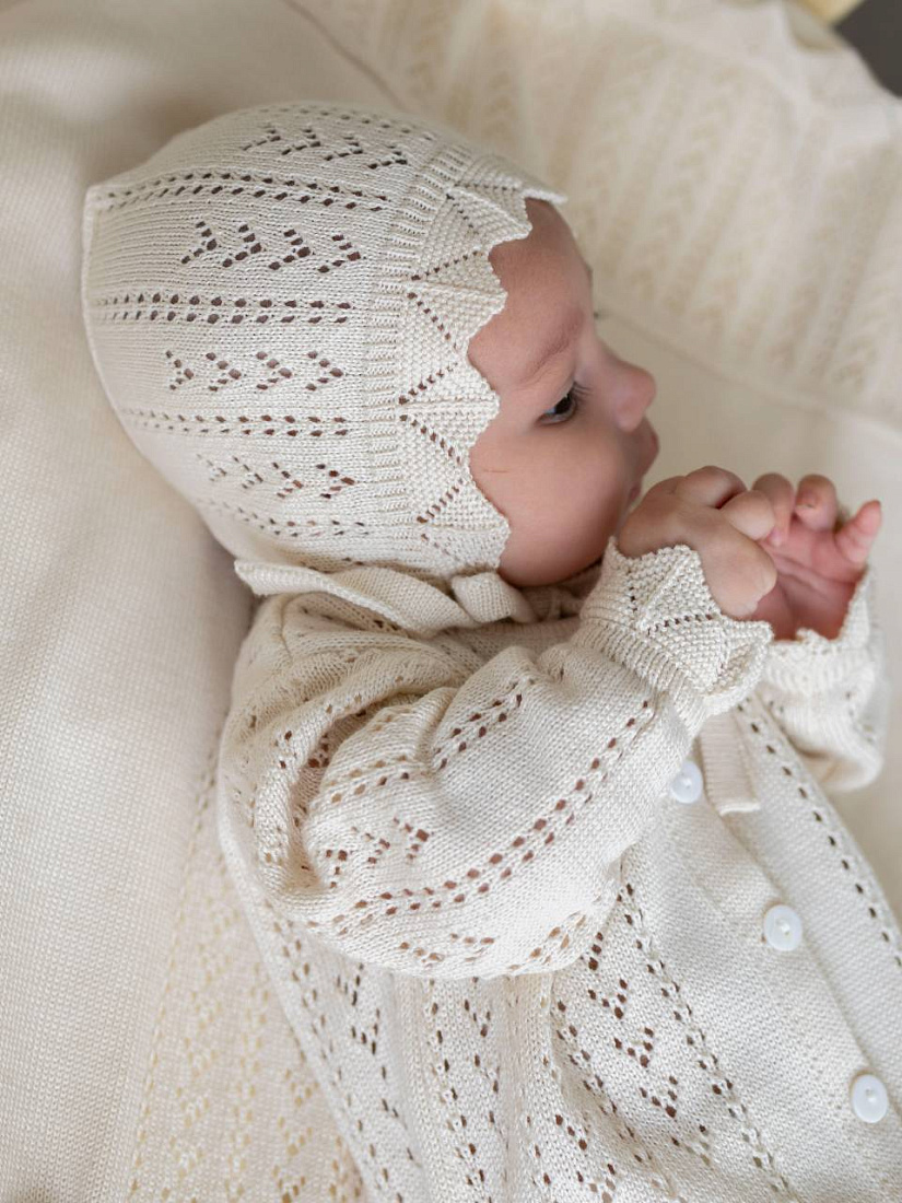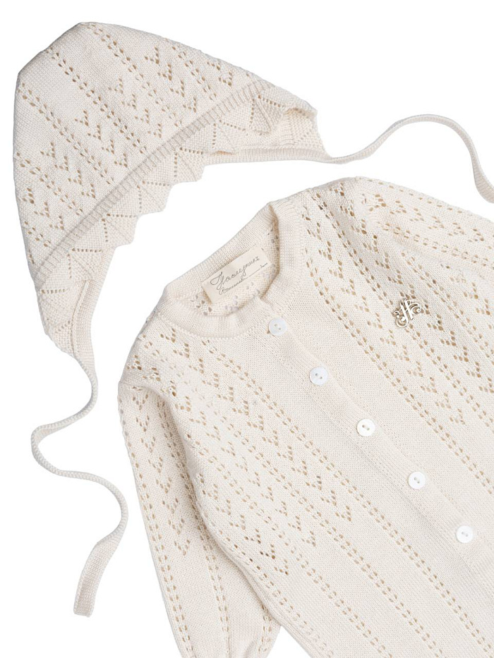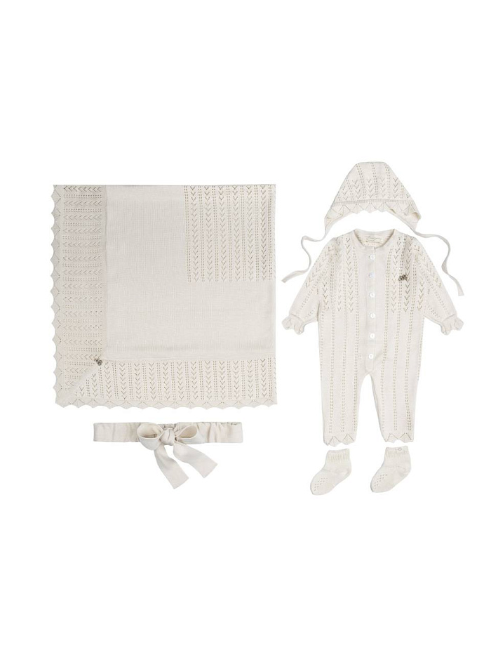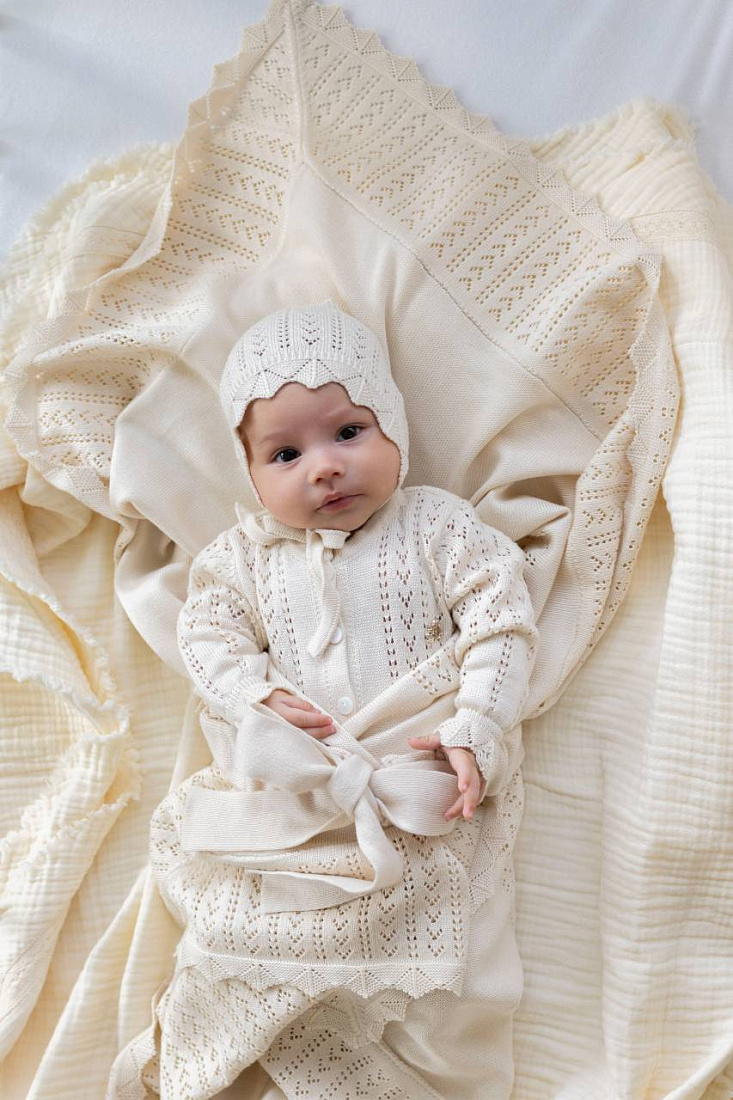 Комплект из 5 предметов «Ажур» выполнен из 100% хлопка, что обеспечивает натуральный состав и комфорт для малыша. Цвет комплекта — цв. натуральный, нежный и универсальный, подходит для мальчиков и девочек. Дизайн отличается ажурным узором, придающим изделиям изысканный и воздушный вид. В комплект входят основные предметы для ухода и уюта новорожденного: ажурный комбинезон с длинными рукавами и застежками на пуговицах, шапочка с завязками, пинетки, декоративный пояс и плед с ажурной отделкой по краям. Каждый предмет набора выполнен из мягкого хлопка, который приятен к телу и хорошо пропускает воздух, поддерживая комфортную температуру. Ажурная вязка делает комплект не только практичным, но и эстетически привлекательным. Благодаря использованию 100% хлопка, комплект легко стирается и быстро сохнет. Натуральный материал идеально подходит для чувствительной кожи малыша, предотвращая раздражения.