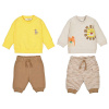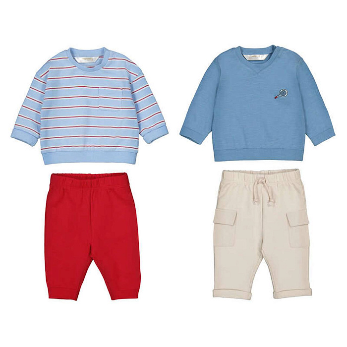 Комплект трикотажный для мальчика состоит из двух кофт и двух брюк, что делает его универсальным решением для повседневного гардероба. В наборе представлена кофта с длинными рукавами в голубую полоску, которая украшена аккуратным нагрудным карманом, и однотонная голубая кофта с лаконичной вышивкой на груди. Оба изделия выполнены из мягкого трикотажного материала, приятного на ощупь и подходящего для нежной кожи ребенка. Брюки представлены в двух цветах: насыщенный красный и светлый бежевый. Красные брюки имеют классический крой с эластичным поясом, обеспечивающим удобную посадку. Бежевые брюки дополнены накладными карманами и регулируемым шнурком на поясе, что добавляет практичности и стиля. Все элементы комплекта легко сочетаются между собой, что позволяет создавать различные варианты образов для мальчика. Трикотажная ткань отличается хорошей воздухопроницаемостью и простотой в уходе. Дизайн изделий современный, с акцентом на комфорт и свободу движений.