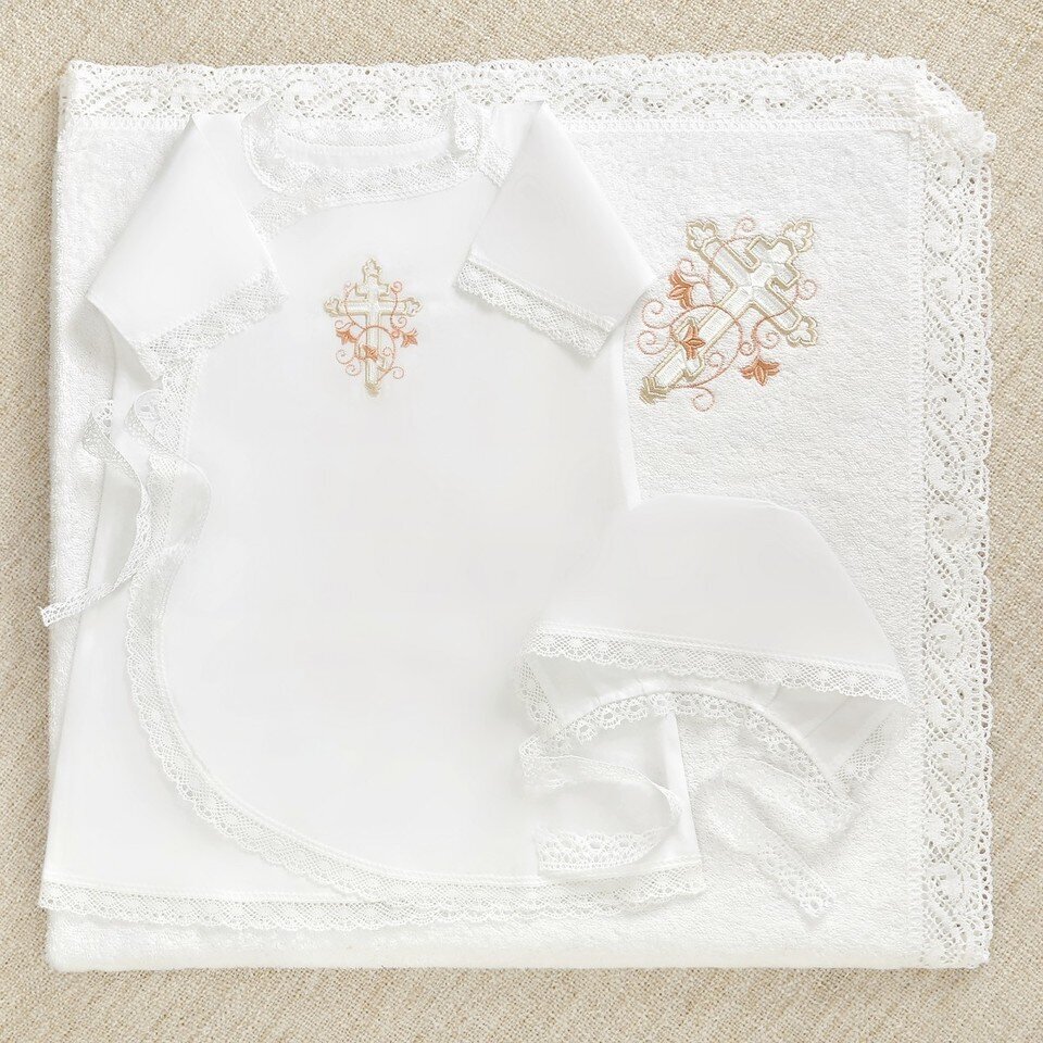 Все выполнено из натурального хлопка. Упаковано в фирменную красивую упаковку с золотым тиснением. Ваш малыш будет чувствовать себя комфортно на протяжении всего таинства крещения.