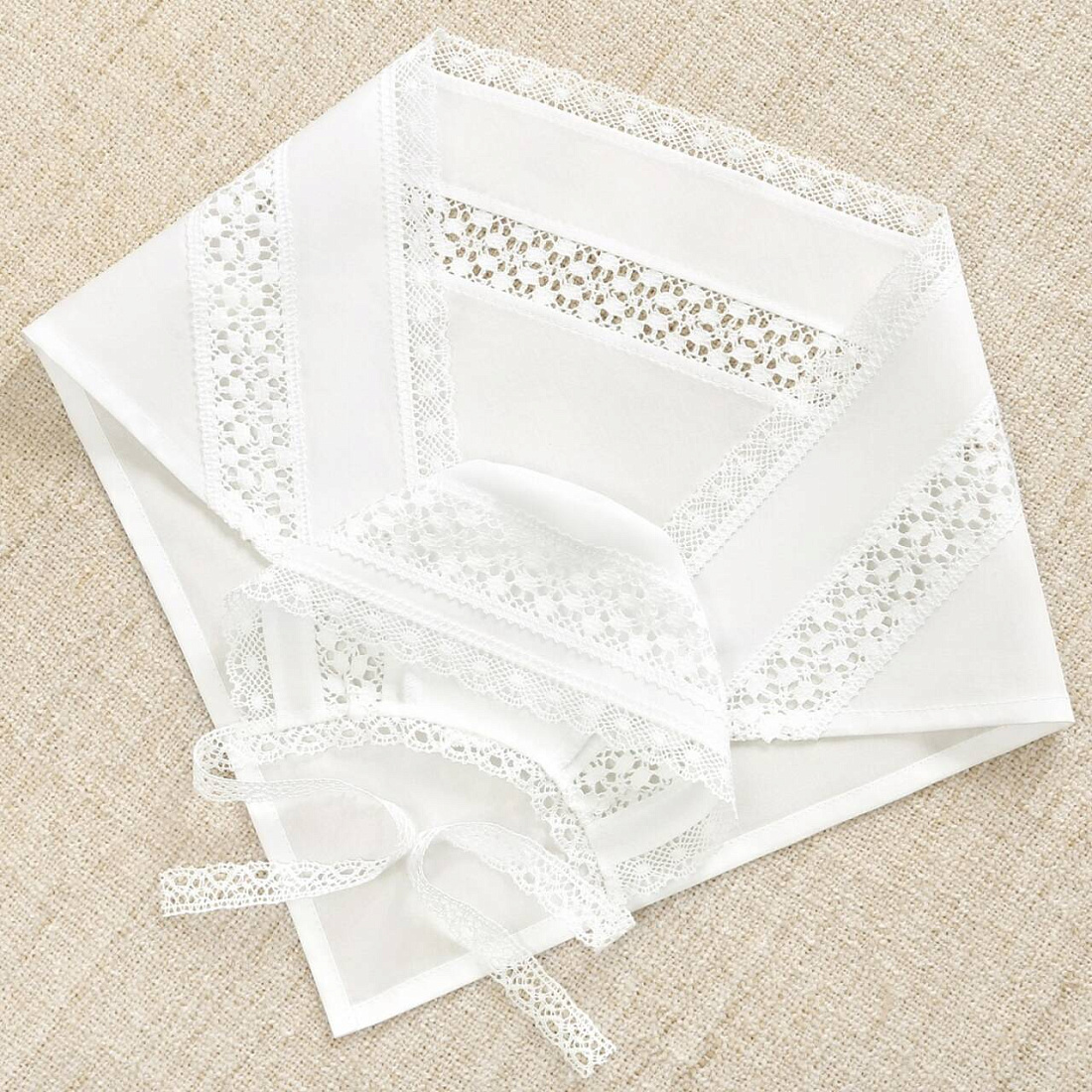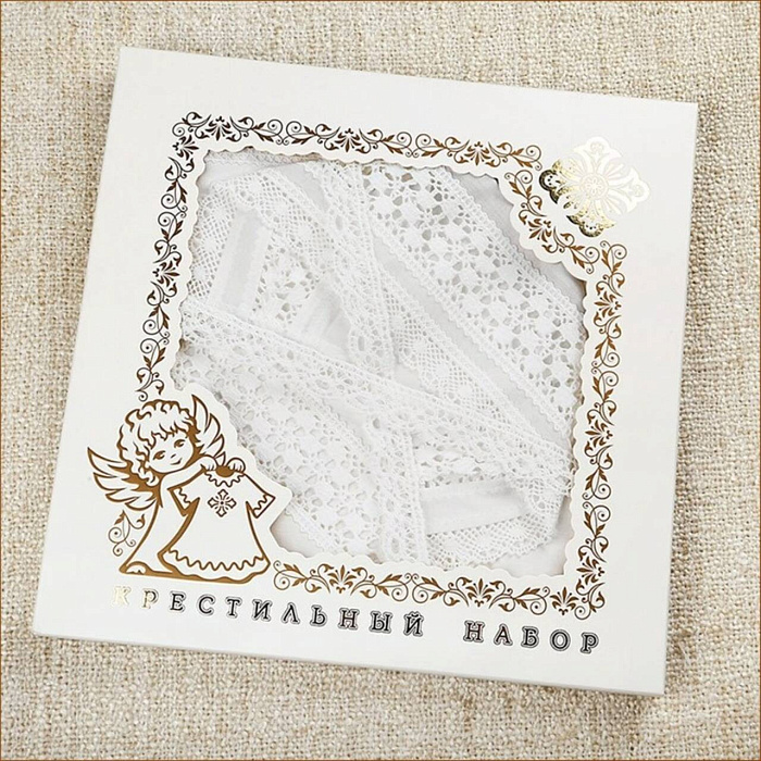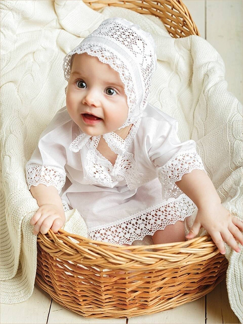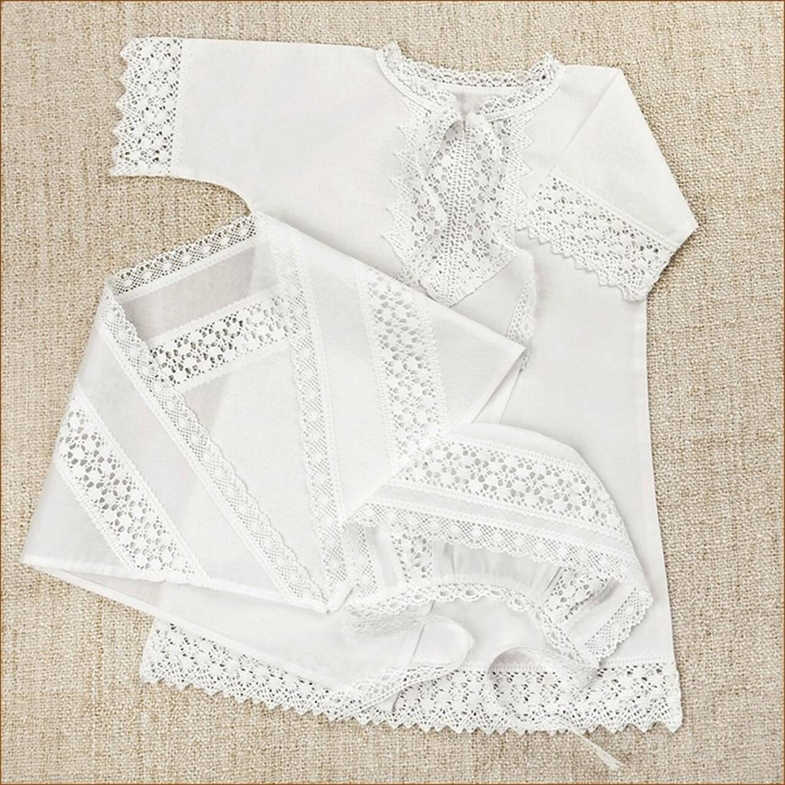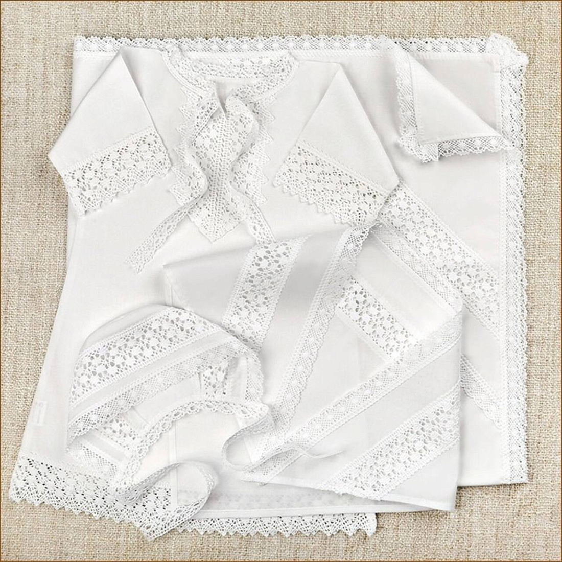 Крестильный набор для девочки: 100% хлопок, широкое плетеное кружево. В комплект из 3-х предметов входит: