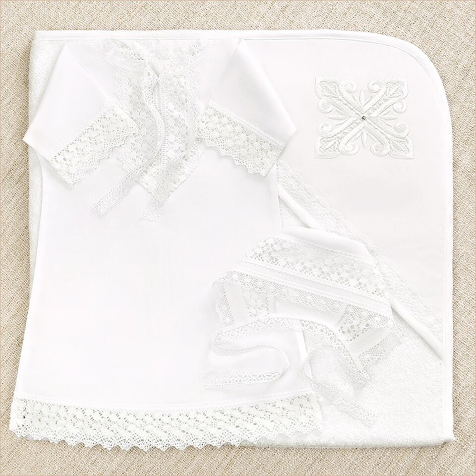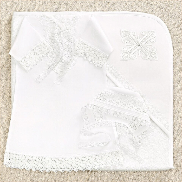 Все выполнено из натурального хлопка. Упаковано в фирменную красивую упаковку с золотым тиснением. Ваш малыш будет чувствовать себя комфортно на протяжении всего таинства крещения.