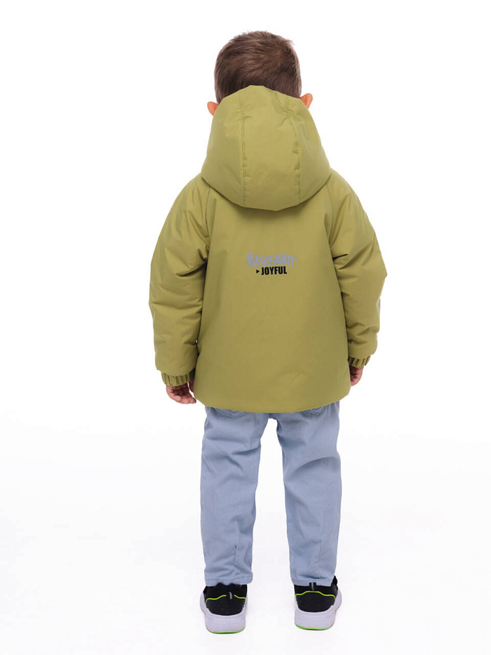 Однотонная эргономичная куртка для мальчиков из тонкой мембранной ткани. Подкладка из флиса. Рукав-реглан. Вход в карманы закрыт большими клапанами зафиксированными в боковом шве. Над клапаном левого кармана, прорезной карман с молнией. Фронтальная молния закрыта широкой ветрозащитной планкой. Планка фиксируется кнопками. Манжеты рукавов обработаны эластичной тесьмой. Несъемный капюшон. Регулировка лицевой части капюшона  выполнена с помощью кулисы со шнуром. Вся фурнитура лаконичного черного цвета. В поддержку - черный и светоотражающий термопринт на спинке и в нижней части левой полочки. На правом рукаве светоотражающий термопринт.