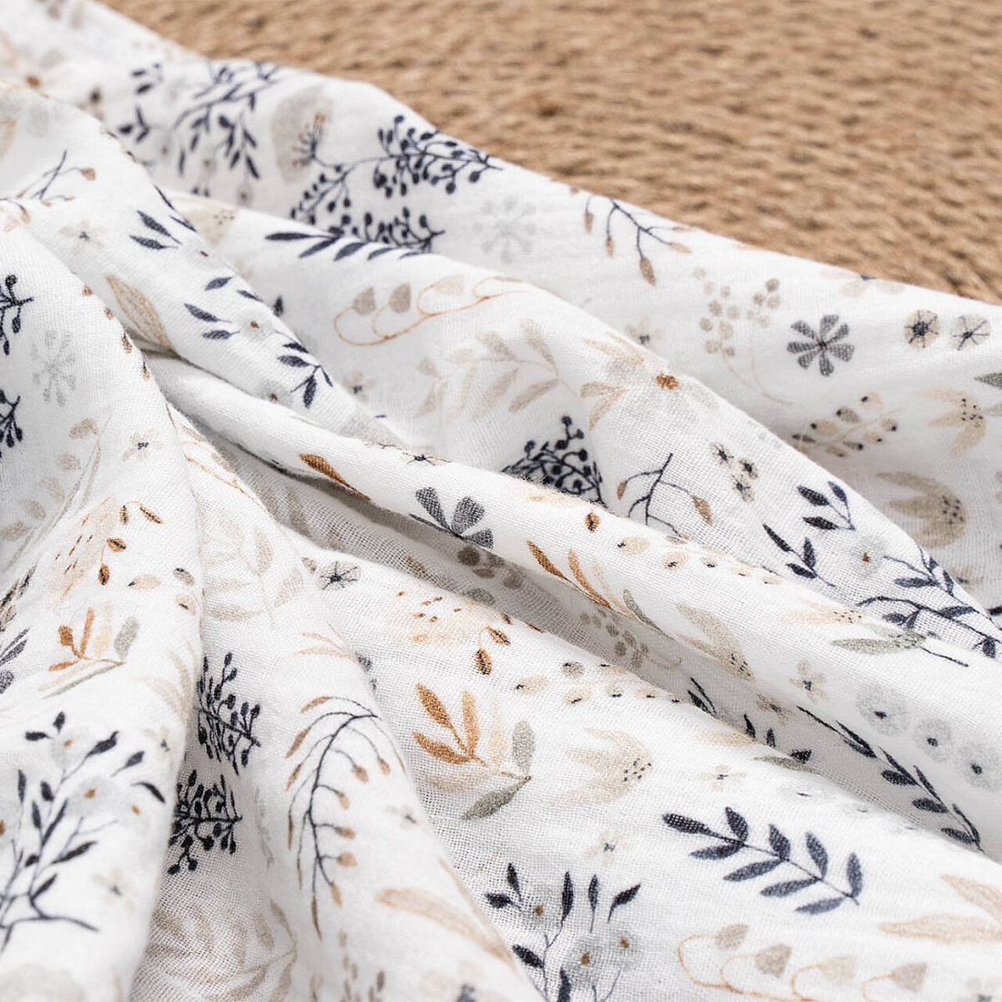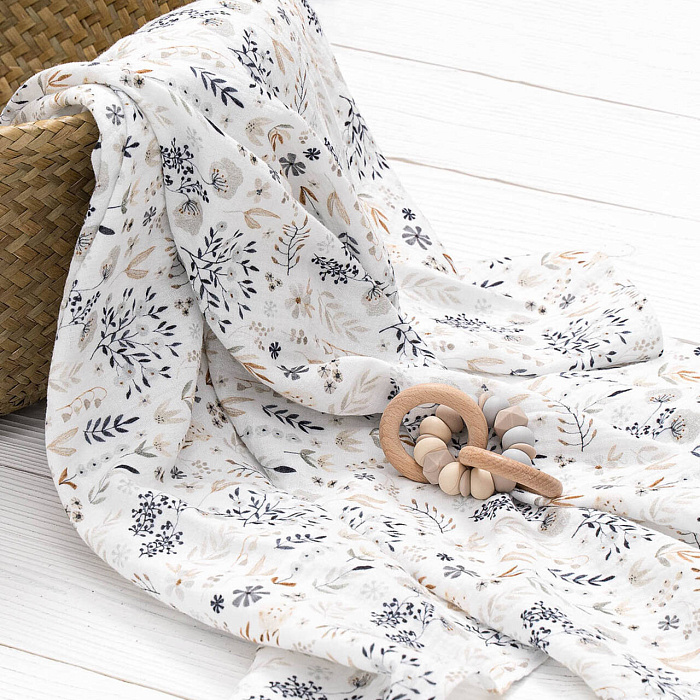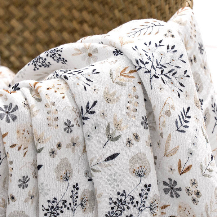 Ткань — премиальный жатый муслин высокого качества. Пеленки из жатого муслина более мягкие и сохнут гораздо быстрее, чем обычные. Такая ткань хорошо пропускает воздух, в них комфортно в любую погоду благодаря терморегулирующим свойствам.