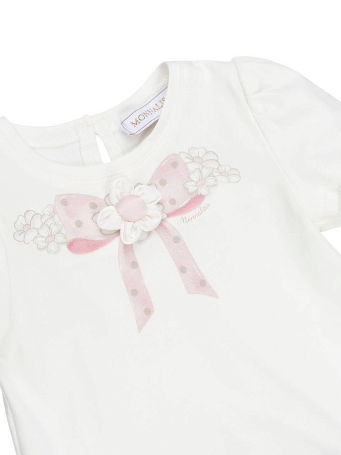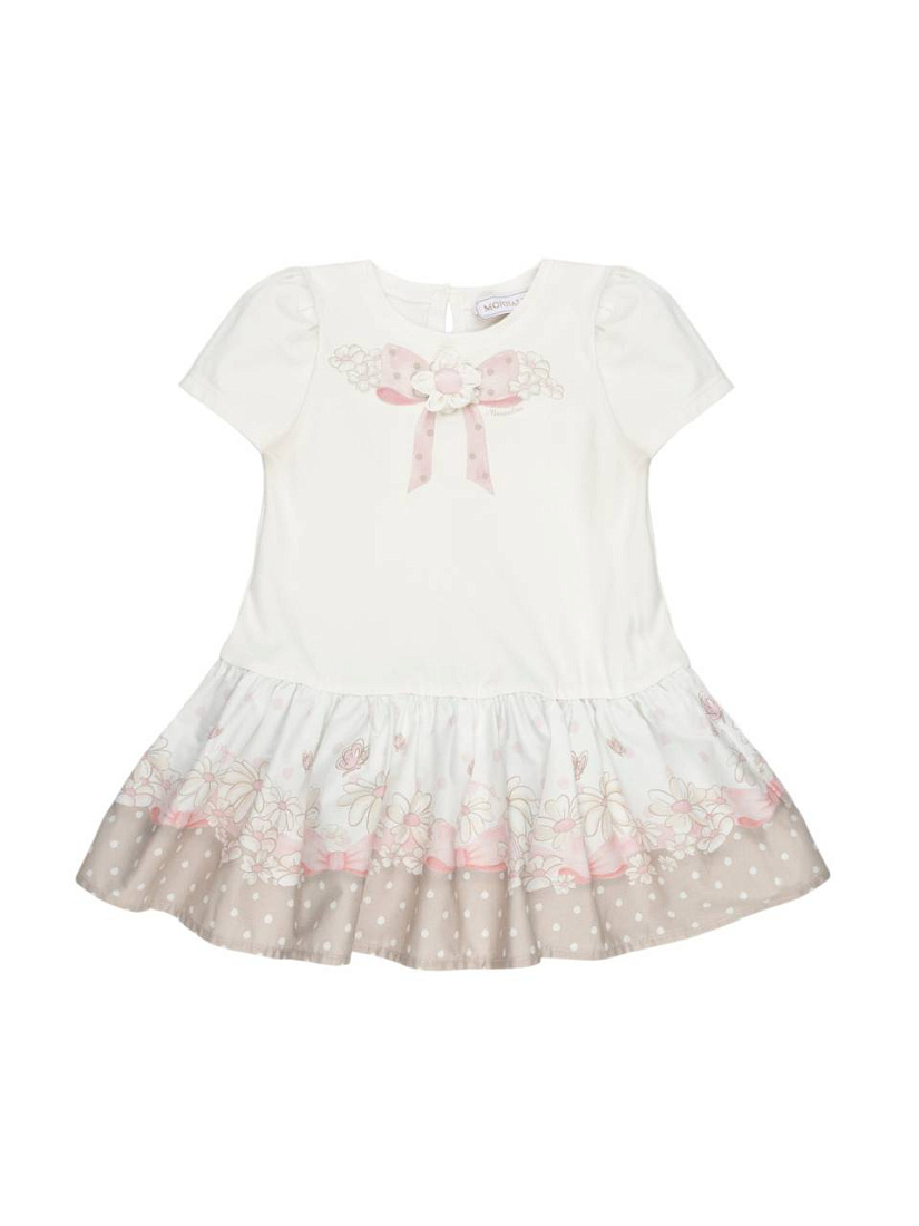 Платье для девочки выполнено из мягкого и приятного на ощупь материала, что обеспечивает комфорт в течение всего дня. Модель имеет короткие рукава и круглый вырез, что делает изделие универсальным для ежедневной носки и особых случаев. Основной цвет — нежный белый, который прекрасно сочетается с декоративными элементами. На груди расположена изящная аппликация в виде розового банта с гороховым принтом и цветочком, придающая образу легкость и утонченность. Юбка платья оформлена плавным переходом цвета от белого к светло-бежевому, украшена деликатным цветочным рисунком и мелкими горошинами, что создает ощущение воздушности и нежности. Классический крой платья обеспечивает свободу движений, а застежка на пуговицу на спинке облегчает процесс переодевания. Дизайн изделия подчеркивает индивидуальность и стиль, делая его отличным выбором для праздников, фотосессий или повседневной носки.