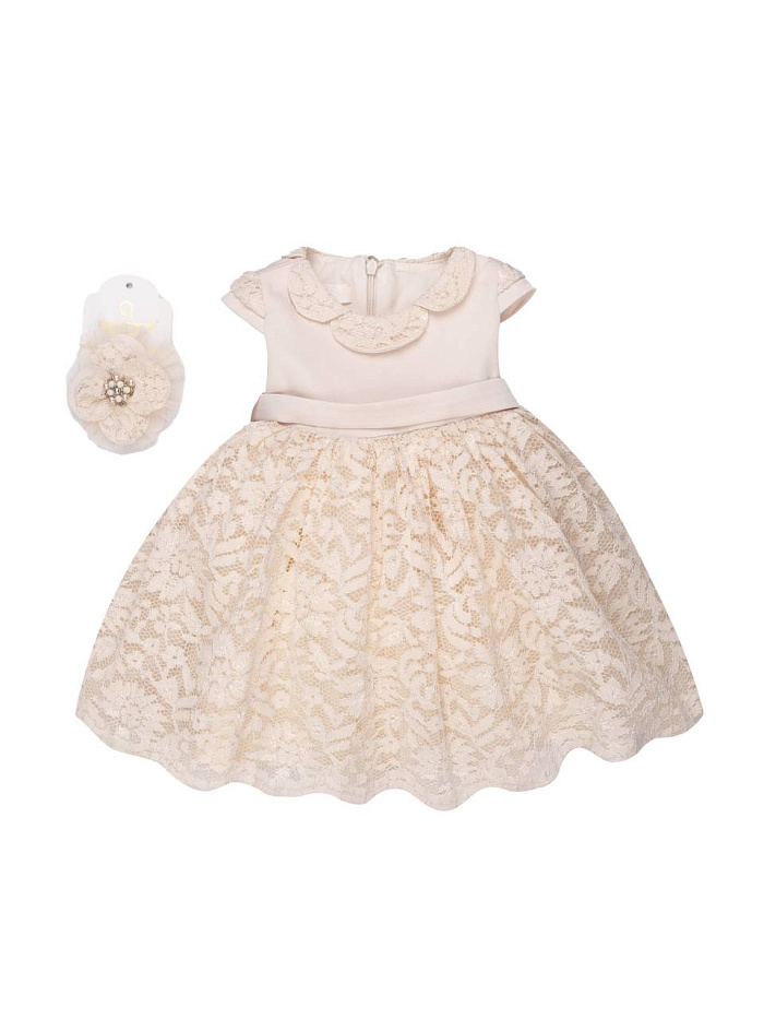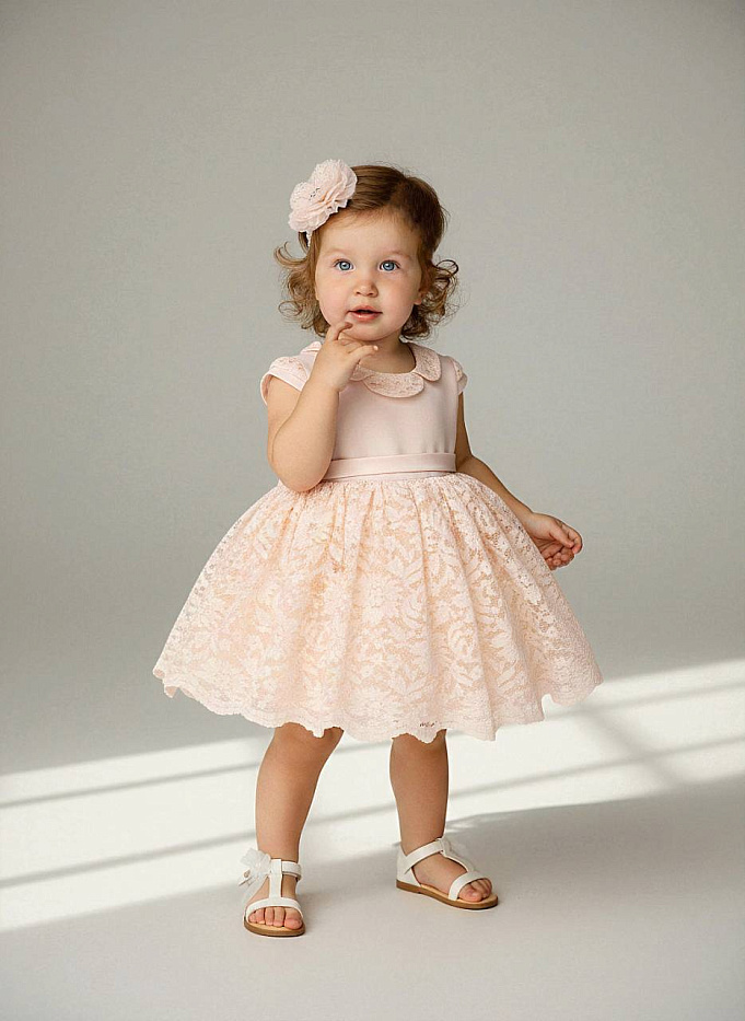 Платье выполнено в коралловом оттенке, который идеально подчеркивает детскую нежность и создает праздничное настроение. Модель отличается элегантным кроем с короткими рукавами и округлым воротничком с мягкими декоративными воланами. Верхняя часть изделия изготовлена из гладкого материала, приятного на ощупь и комфортного для детской кожи. Юбка пышная, выполнена из легкой полупрозрачной ткани с изящным цветочным узором, дополнена подкладкой, обеспечивающей удобство при носке и аккуратный внешний вид. Фактура юбки создает легкий объем и воздушность, благодаря чему образ смотрится нарядно и эффектно. На поясе присутствует аккуратный декоративный элемент, который подчеркивает талию и завершает общий образ. Застежка на спинке позволяет легко надевать и снимать изделие. В комплект входит аксессуар для волос — повязка с крупным текстильным цветком, гармонирующая по цвету и фактуре с основным нарядом. Такое сочетание делает образ завершенным и праздничным.