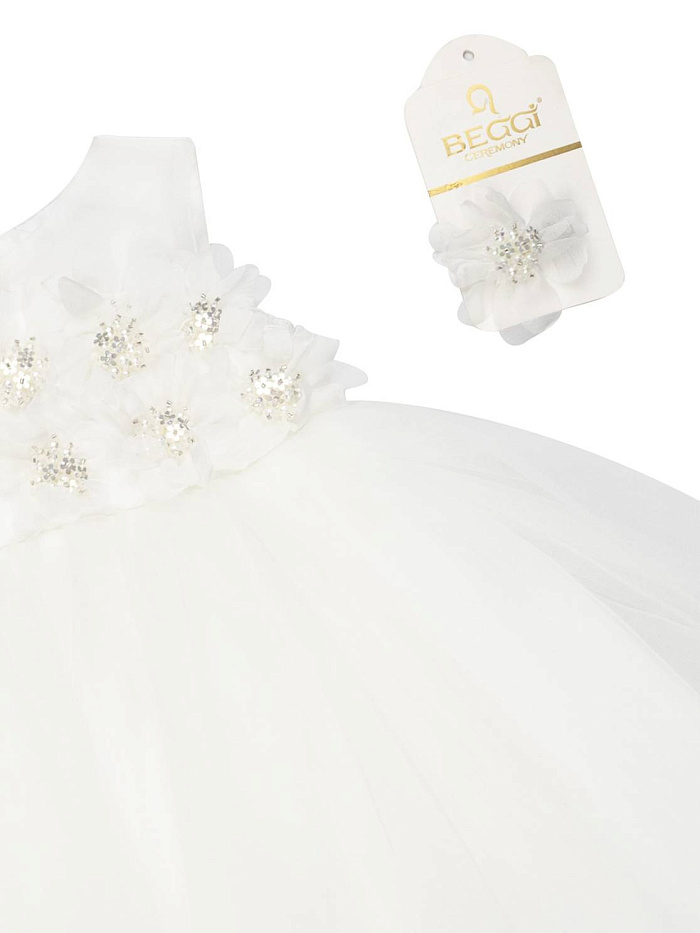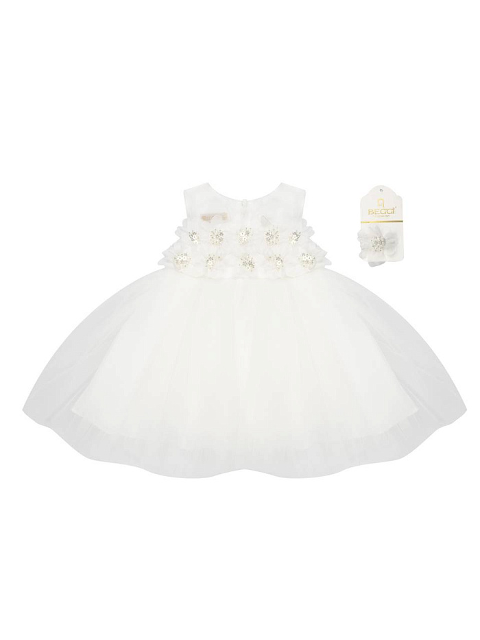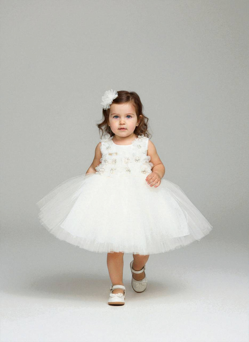 Платье для девочки выполнено в элегантном стиле и идеально подходит для особых случаев. Основной цвет — кремовый, что придает образу нежность и чистоту. Верхняя часть изделия декорирована объемными цветочными аппликациями, которые добавляют нарядности и подчеркивают праздничный характер вещи. Юбка имеет пышную форму, благодаря многослойной структуре из легкой фатиновой ткани, создающей воздушный и торжественный эффект. Материал визуально выглядит мягким и приятным на ощупь, что обеспечивает комфорт при носке. Круглый вырез горловины и отсутствие рукавов делают модель универсальной для теплого времени года или для помещения. К платью прилагается аксессуар для волос в виде цветка, который гармонично дополняет общий образ и завершает наряд. Конструкция изделия позволяет ребенку свободно двигаться, а прочные швы гарантируют долговечность использования. Детализированная отделка и аккуратная работа с тканью создают впечатление высокого качества.