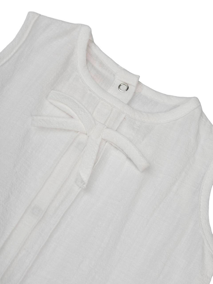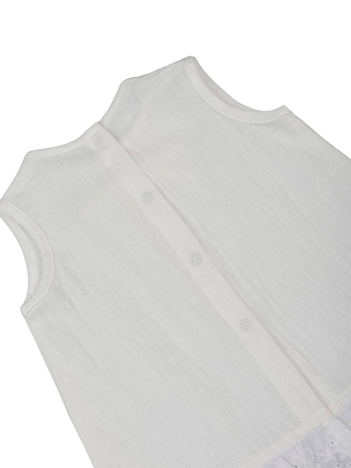Топ ЛЕЯ для девочки выполнен в нежном светлом оттенке, который идеально подойдет для летнего гардероба. Модель без рукавов, что обеспечивает свободу движений и комфорт в жаркую погоду. Дизайн отличается лаконичностью и аккуратностью: спереди присутствует декоративный бантик, придающий изделию легкую элегантность. По низу изделия проходит изящная оборка с ажурным узором, добавляющая нарядности и подчеркивающая оригинальный стиль топа. Кнопки на спинке делают процесс надевания максимально удобным и быстрым, а также надежно фиксируют топ на ребенке. Материал кажется легким, воздушным и приятным на ощупь, хорошо пропускает воздух, что особенно важно для активных девочек. Текстура ткани гладкая, без лишних деталей, что подчеркивает универсальность изделия. Благодаря классическому крою и светлому цвету, топ ЛЕЯ гармонично сочетается с различными элементами гардероба для девочки — шортами, юбками или брюками.