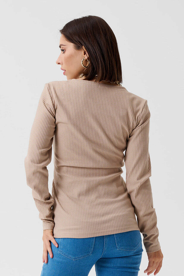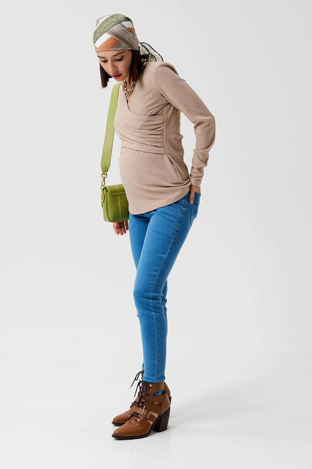 Блузка для беременных и кормящих мам бежевого оттенка длиной до середины бедра. V-образный вырез горловины и имитация запаха делает акцент на зоне декольте. Блуза для беременных с длинным рукавом добавляют образу элегантности. При этом фасон учитывает изменение размеров будущей мамы - эластичное полотно предусматривает необходимый простор в области талии. Модель можно использовать как блуза для кормящих, отодвинув в сторону часть запаха. Модель универсальна, подойдет как блузка для беременных офисная, блузка женская для беременных, блузка для будущих мам, блуза для беременных лапша, блузка для кормящих мам, блузка для кормления, блузка для беременных трикотажная, кофта для беременных, кофточка для беременных.