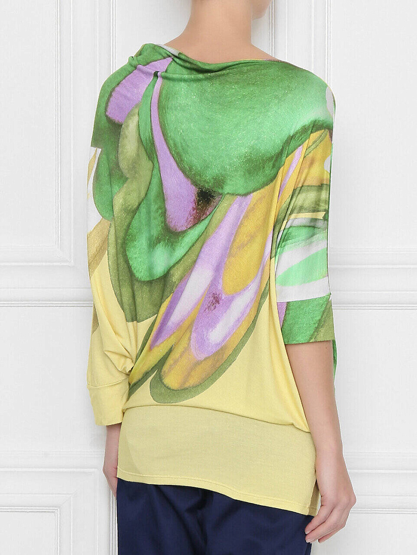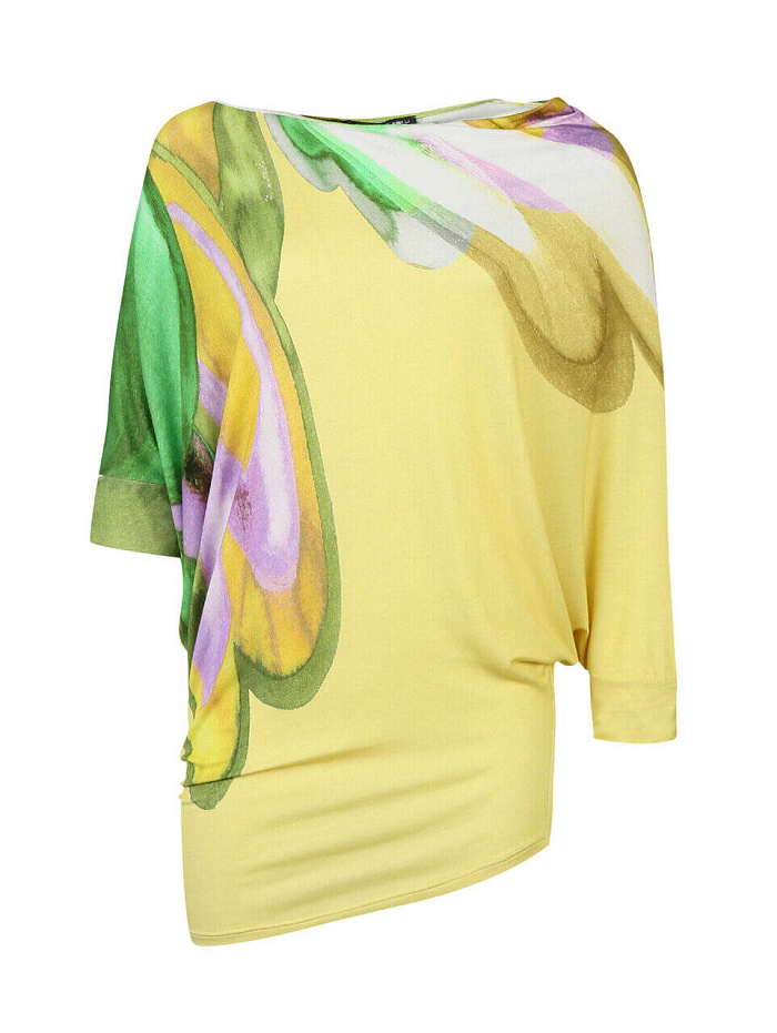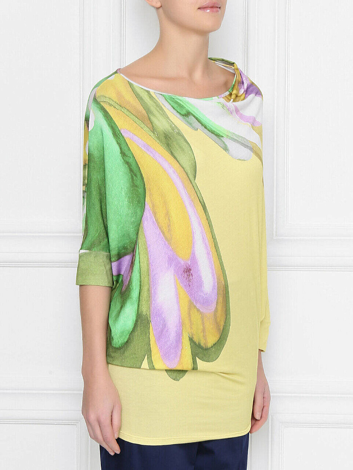 Удлиненная футболка с рукавами до локтя привлекает взгляды акварельным рисунком в лимонно-желтом, зеленом и сиреневом оттенках, который напоминает картину авангардиста. Эта модель из коллекции Pietro Brunelli прекрасно сочетается с однотонными брюками или юбкой, а также с денимом.