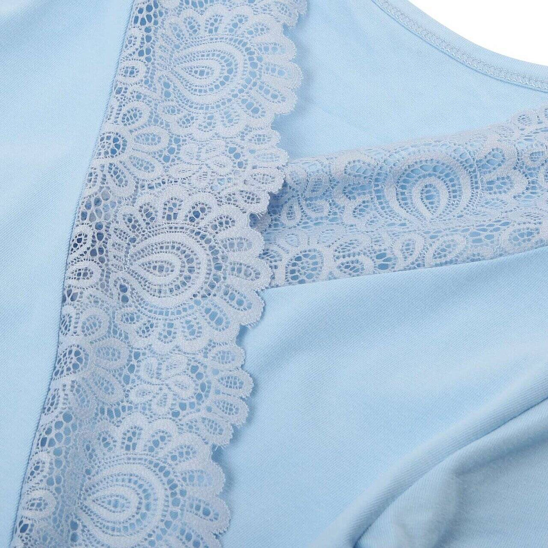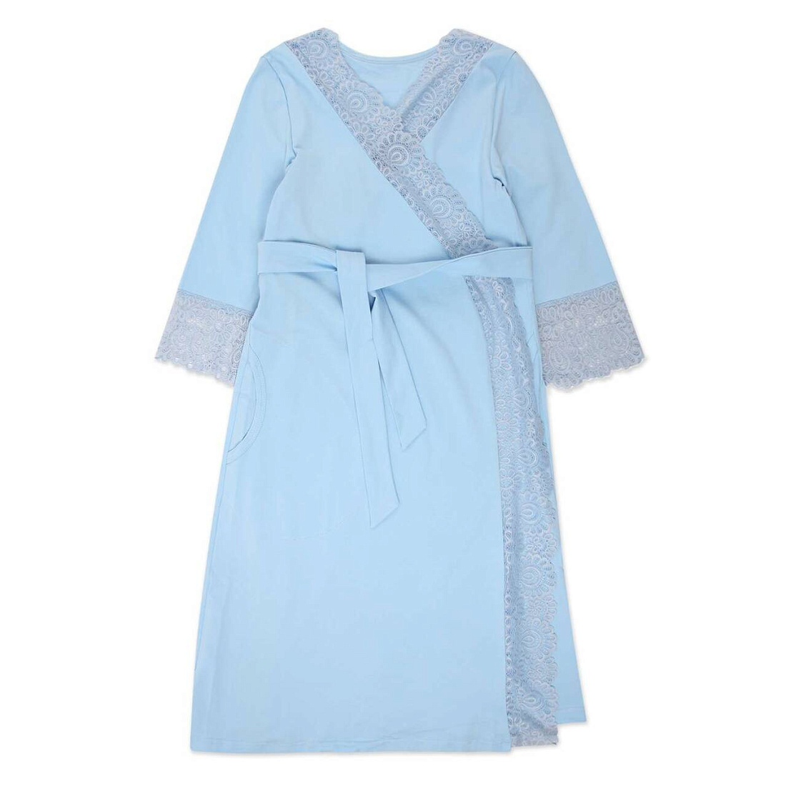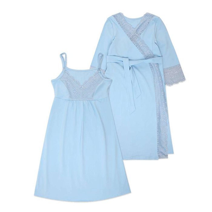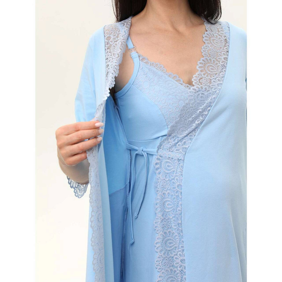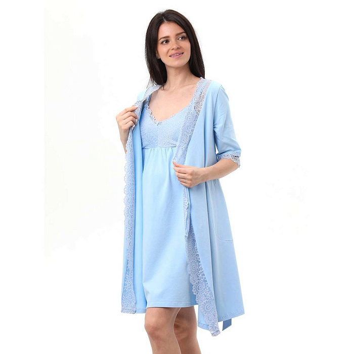 Домашний комплект для беременных и кормящих мамочек, состоящий из халата и сорочки. Сорочка имеет бретели с отстегивающимися клипсами для кормления. Украшена нежным кружевом. Халат украшен кружевом на полочке и рукавах. Комплект выполнен из натурального полотна. Отлично подойдет будущим мамам на любом сроке беременности.