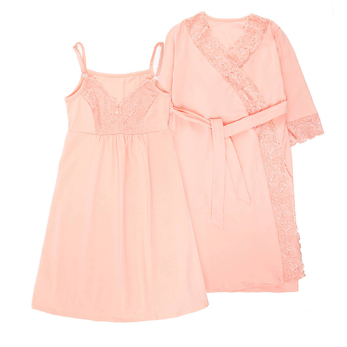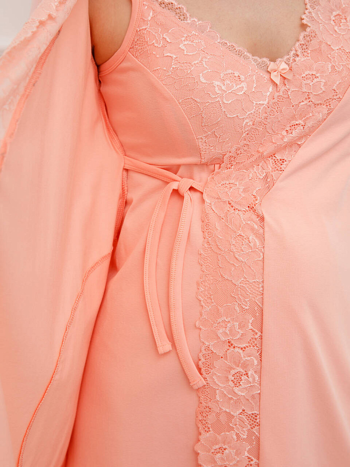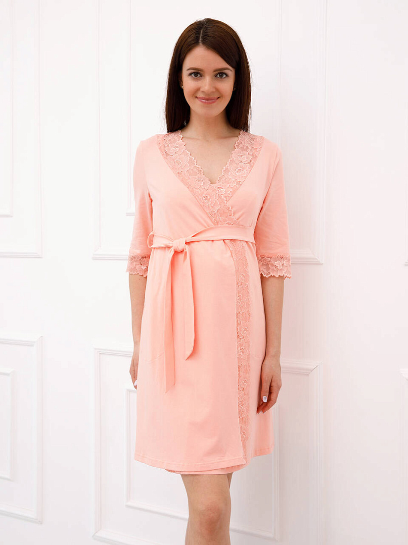 Домашний комплект для беременных и кормящих мамочек, состоящий из халата и сорочки. Сорочка имеет бретели с отстегивающимися клипсами для кормления. Украшена нежным кружевом. Халат украшен кружевом на полочке и рукавах. Комплект выполнен из натурального полотна. Отлично подойдет будущим мамам на любом сроке беременности.
