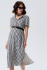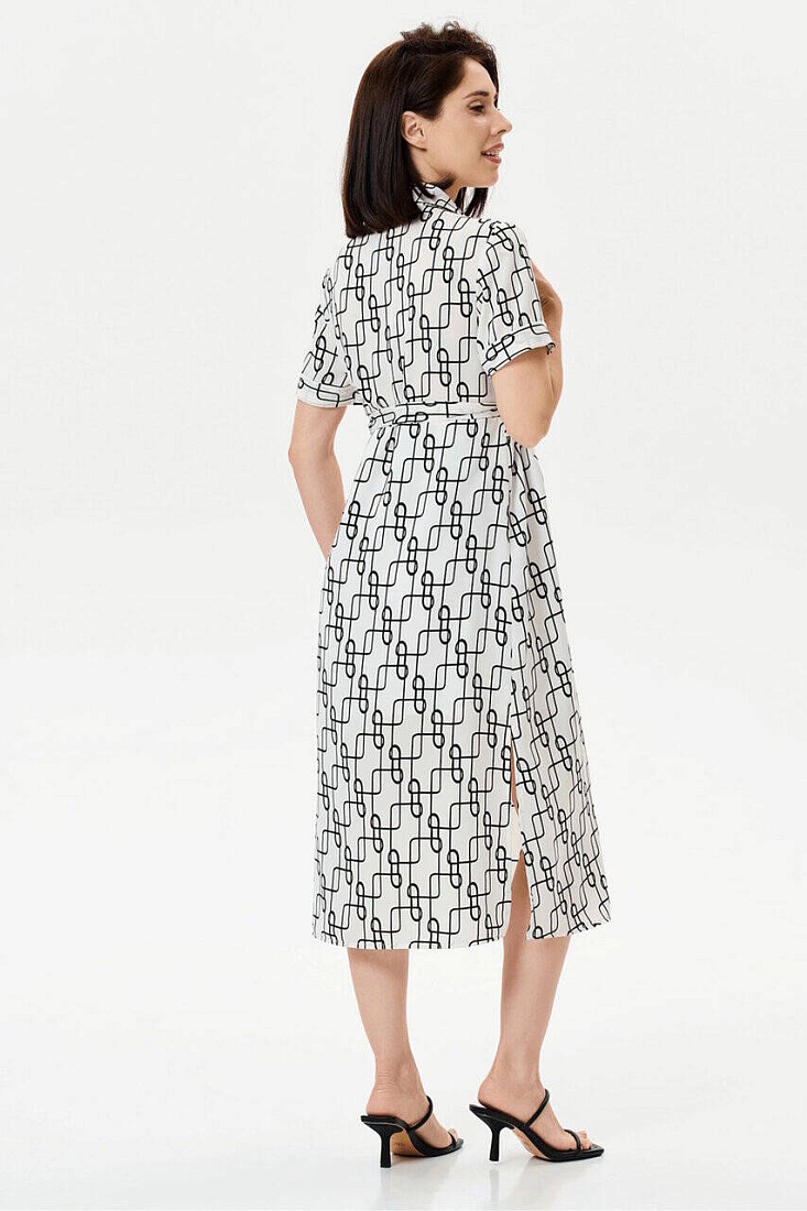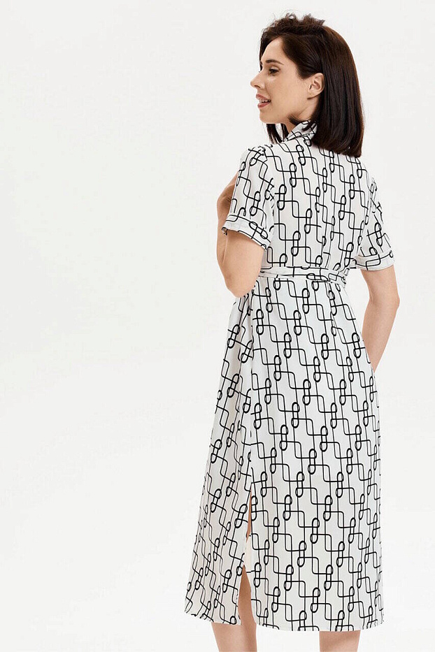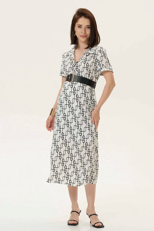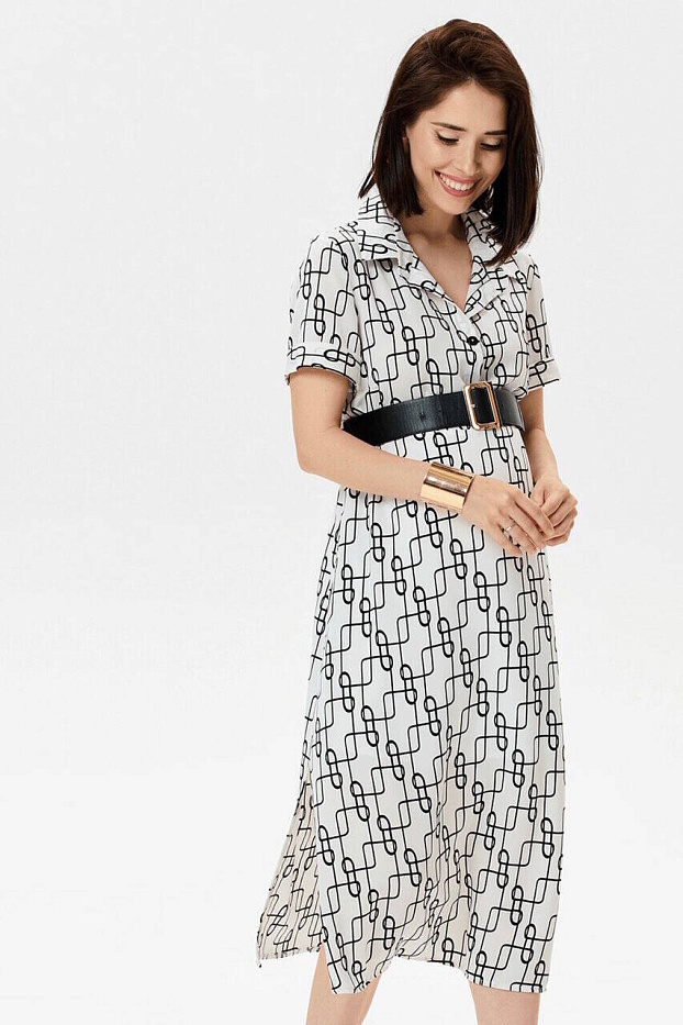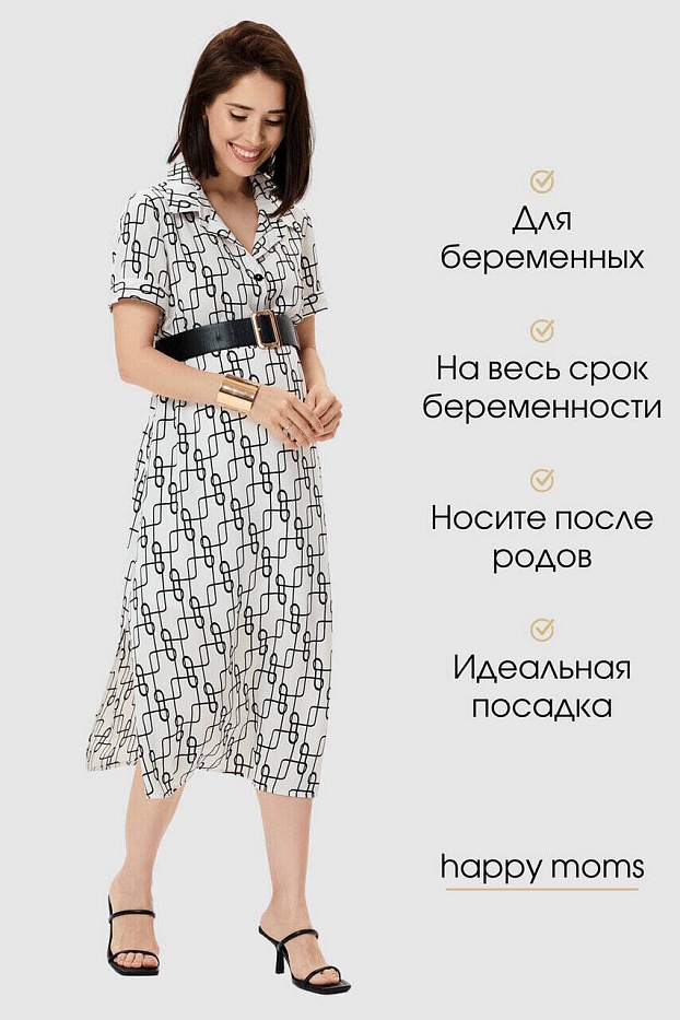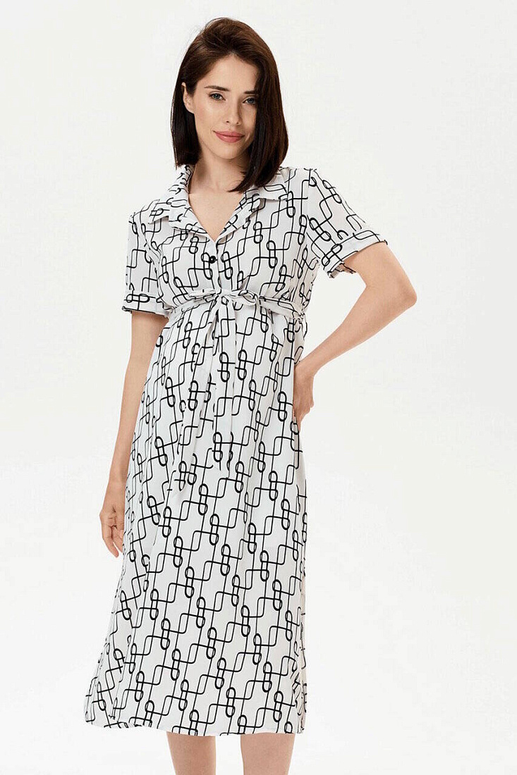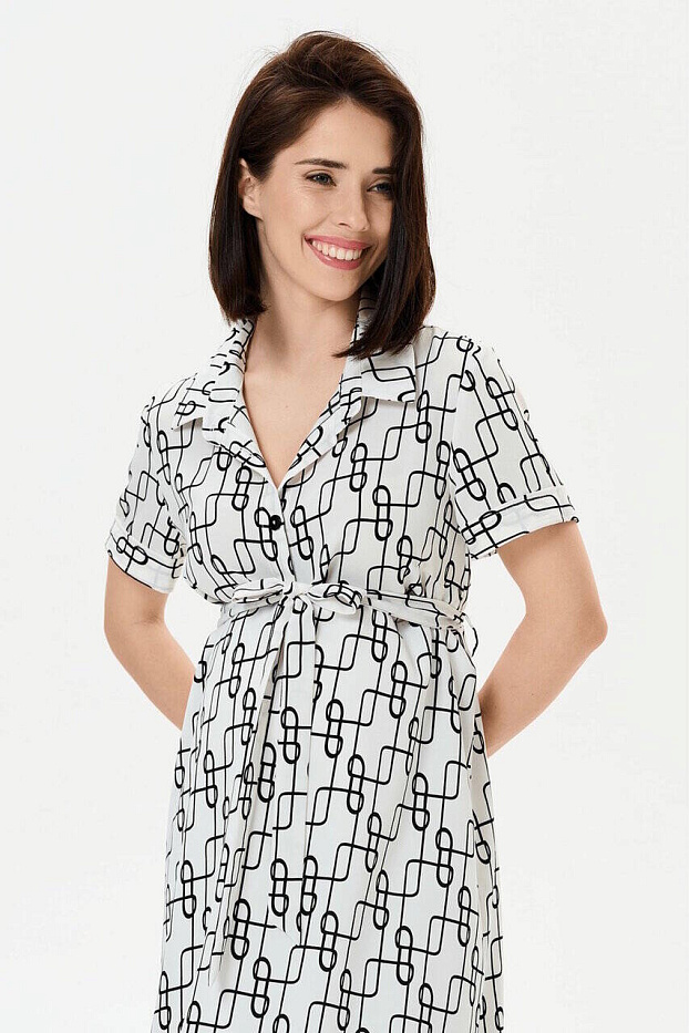 Летнее платье с геометричным принтом. Идеальный вариант для прогулок и визитов в офис, если мама продолжает работать. Силуэт прямой, ширина модели регулируется тканевым поясом. Пояс можно заменить любым другим, широким, кожаным – в контраст цвету платья. По бокам модели высокие разрезы, короткие рукава с аккуратными проймами заканчиваются манжетами. Рубашечный воротник и планка на пуговицах в районе груди. Ткань легкая, хорошо пропускает воздух. Фасон отлично сидит по фигуре на любом сроке беременности, отрегулировав объем платья поясом, его можно носить и после родов.