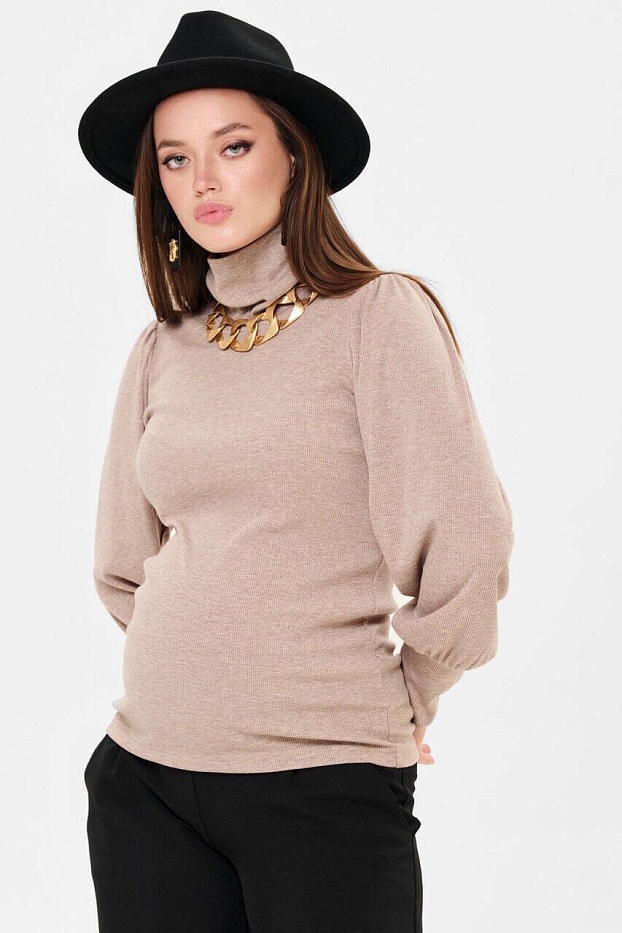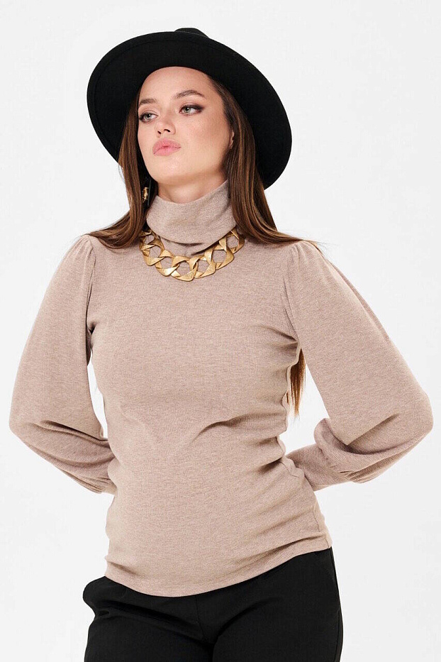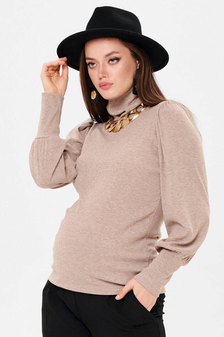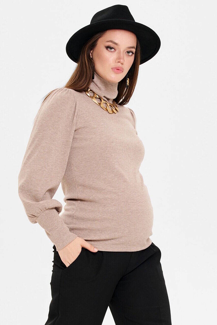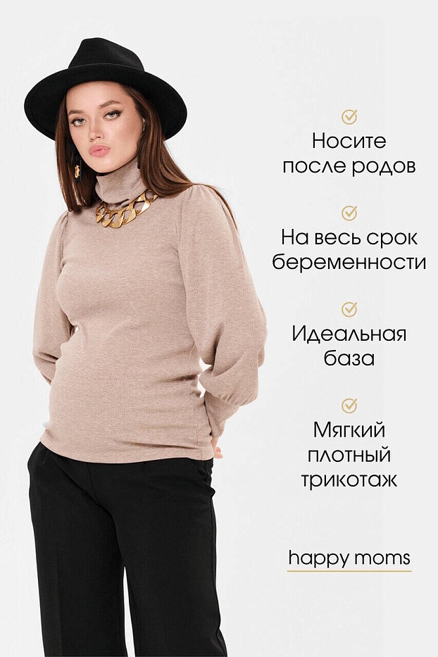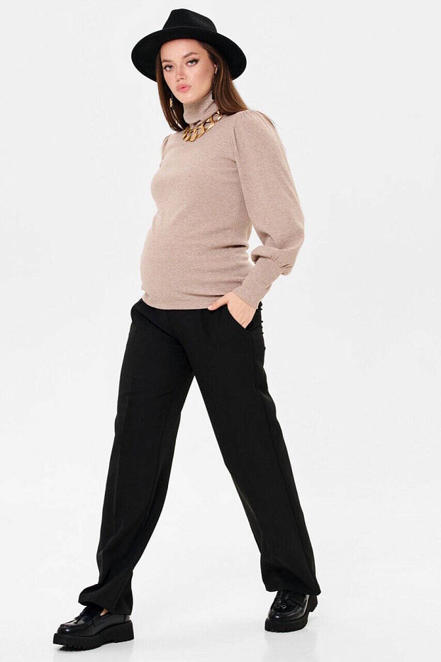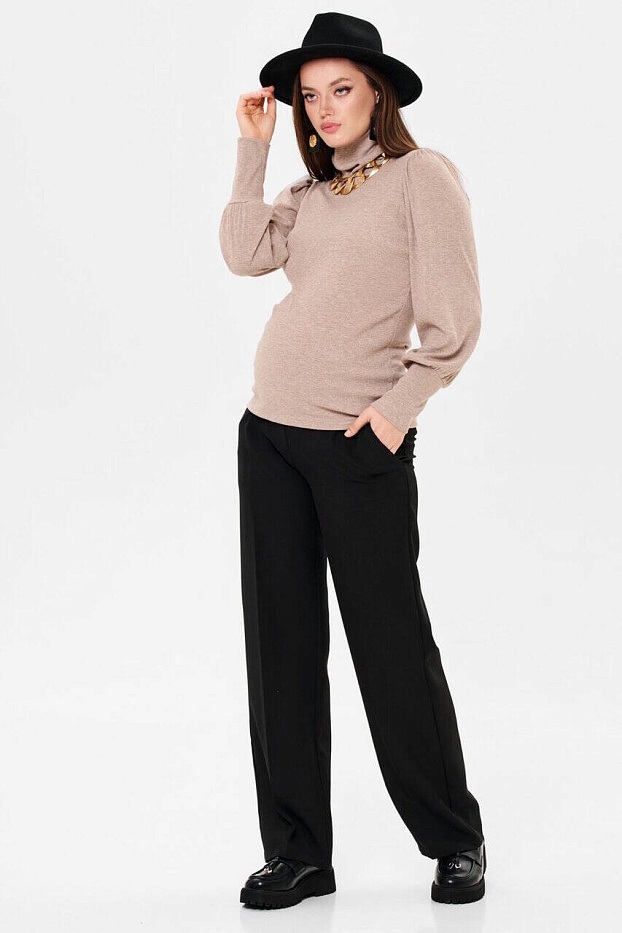 Головина с высоким воротником-стойкой, который можно подвернуть. Объём на животик создаётся за счёт эластичности ткани. Модные свободные рукава со сборками по окату и широкими манжетами разбавят минимализм фасона. Трикотаж мягкий, плотный, приятный телу. Подойдет для любого срока беременности и после родов.