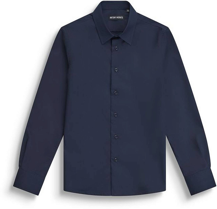 Рубашка для мальчика выполнена в классическом стиле и имеет однотонный темно-синий цвет, который универсален и легко сочетается с различными вариантами одежды. Материал визуально гладкий, плотный и приятный на ощупь, что обеспечивает комфорт в течение всего дня. Дизайн рубашки строгий: прямой крой, длинные рукава с аккуратными манжетами на пуговицах и стандартный отложной воротник. Застежка представлена аккуратным рядом пуговиц по всей длине изделия, что удобно для самостоятельного использования ребенком. Отсутствие лишних декоративных элементов делает эту рубашку подходящей для школьной формы, официальных мероприятий или повседневной носки. Классическая конструкция позволяет рубашке хорошо сидеть на фигуре мальчика, не сковывая движений. Ткань визуально плотная, что говорит о ее долговечности и износостойкости. Благодаря универсальному цвету и лаконичному дизайну, рубашка легко сочетается с брюками, джинсами или жилетами, что расширяет возможности для создания различных образов.
