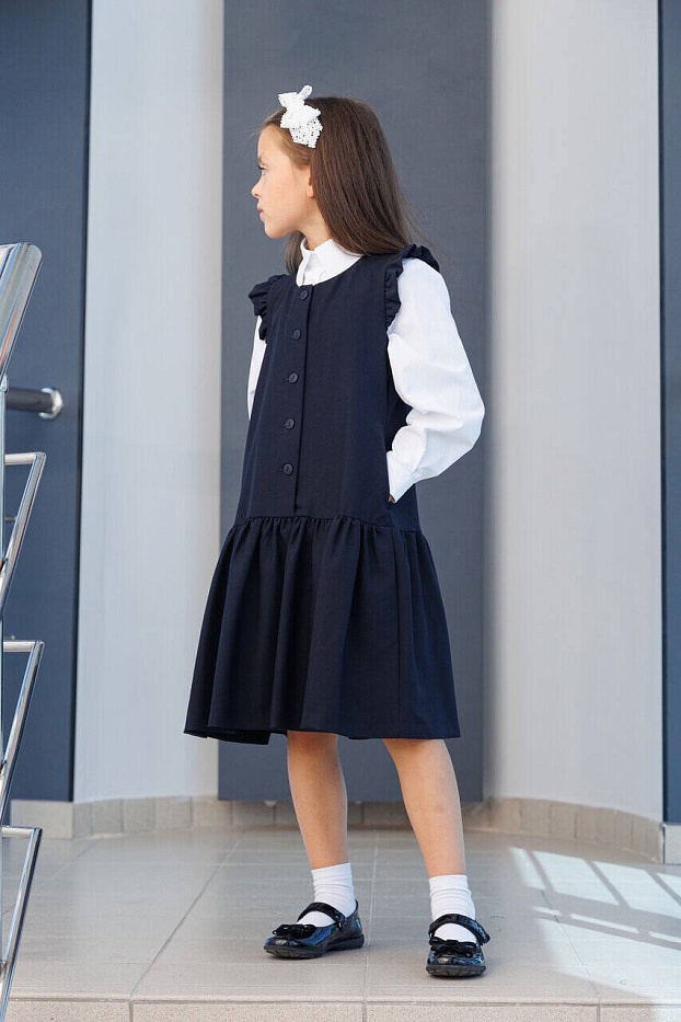 Сарафан слегка расклешенного силуэта с круглой горловиной и заниженной линией талии. Декорирован крылышками. Юбка со сборкой по шву притачивания. Горловина и проймы обработаны подкройными обтачками. В боковых швах лифа карманы. Застёжка центральная бортовая на переде на пуговицы и прорезные петли. Сарафан без подкладки
