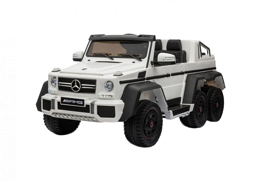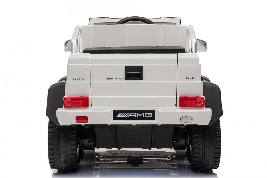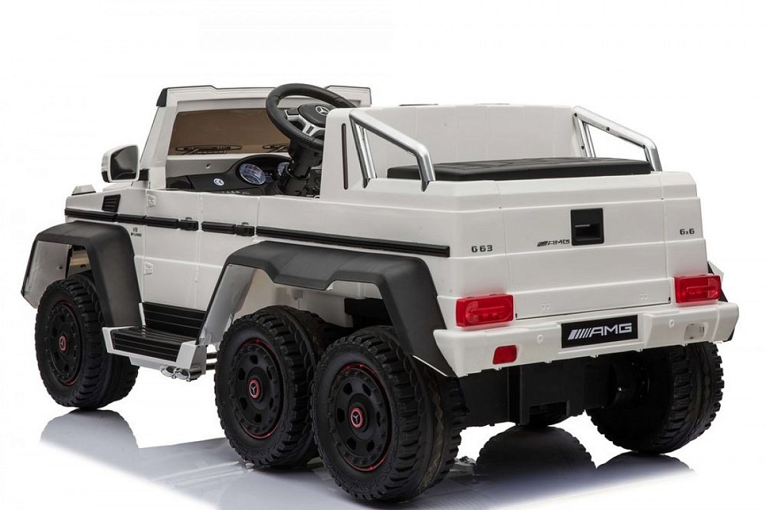 Mercedes-Benz G63-AMG 4WD A006AA (ЛИЦЕНЗИОННАЯ МОДЕЛЬ) с дистанционным правлением. Полноприводный. Шестиколесный. Световые эффекты: диодные огни, фары передние, задние фары, подсветка колес, подсветка днища, подсветка панели приборов. Звуковые эффекты: музыкальный руль - звук клаксона/мелодии заводские. Пульт управления: индивидуальный (настраивается по Bluetooh). Амортизаторы: 6шт, передние и задние. Колеса: каучуковые Скорость: 2-6 км/ч, 2 cкорости вперед, одна назад. Шестиколёсный. Коробка автомат. Кнопка переключения внешняя/внутренняя педаль. Сидение: кожаное, ремень безопасности пяти-точечный, регулируется вперед/назад, Для родителей: Багажник - дополнительное сиденье. Внешняя педаль. Включение: кнопка. Открываются двери, капот, багажник (съемный аккумулятор - можно заряжать отдельно). Медиа-панель: microSD-вход, USB-вход, mp3-вход, индикатор заряда батареи.