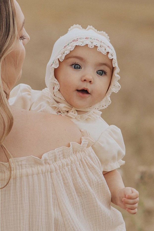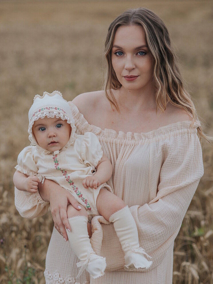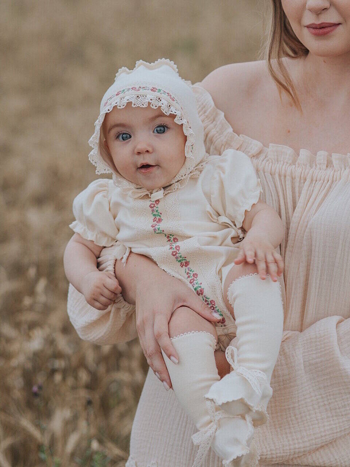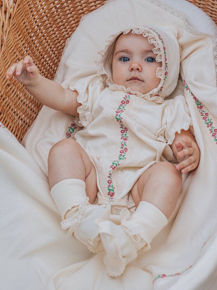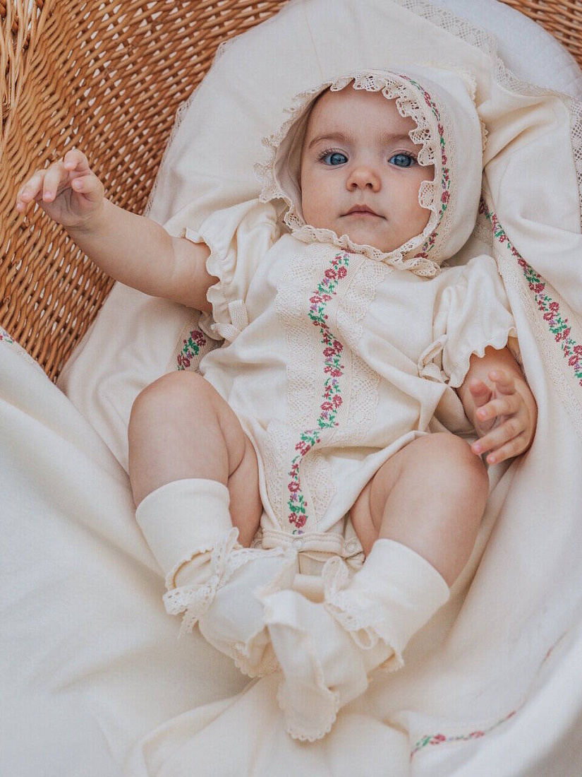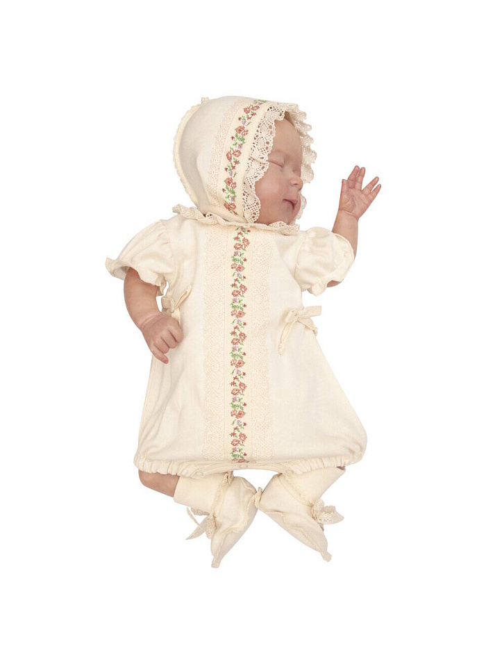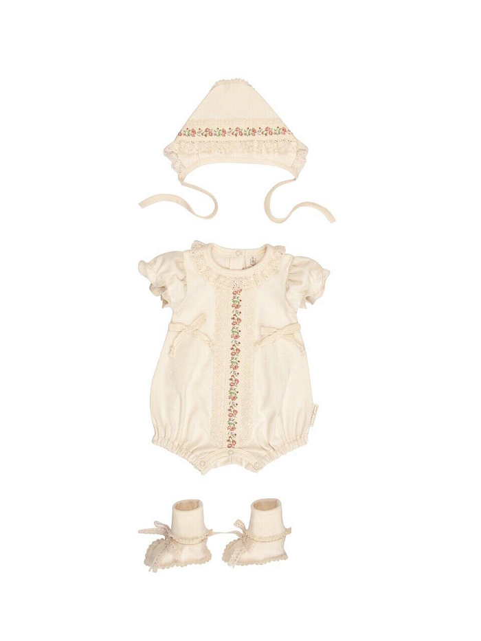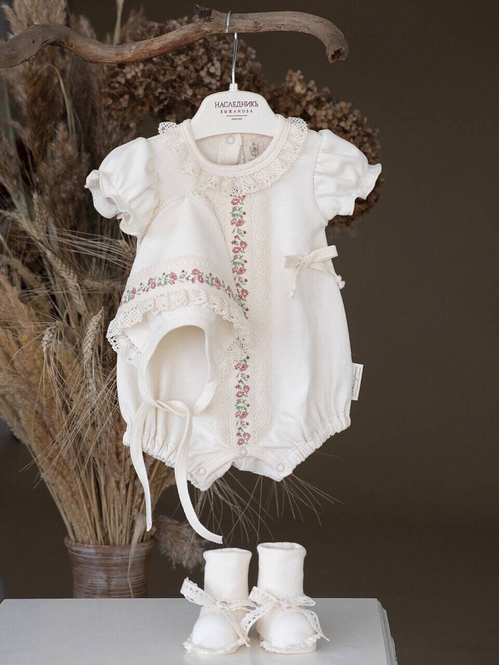Комплект не только на прогулку , но и украсит торжественную выписку из роддома.Натуральный органический хлопок создает атмосферу комфорта , а дизайнерское решение в отделке, делают комплект уникальным стильным современным. Комплект для девочки: комбинезон (песочник), чепчик, пинетки.