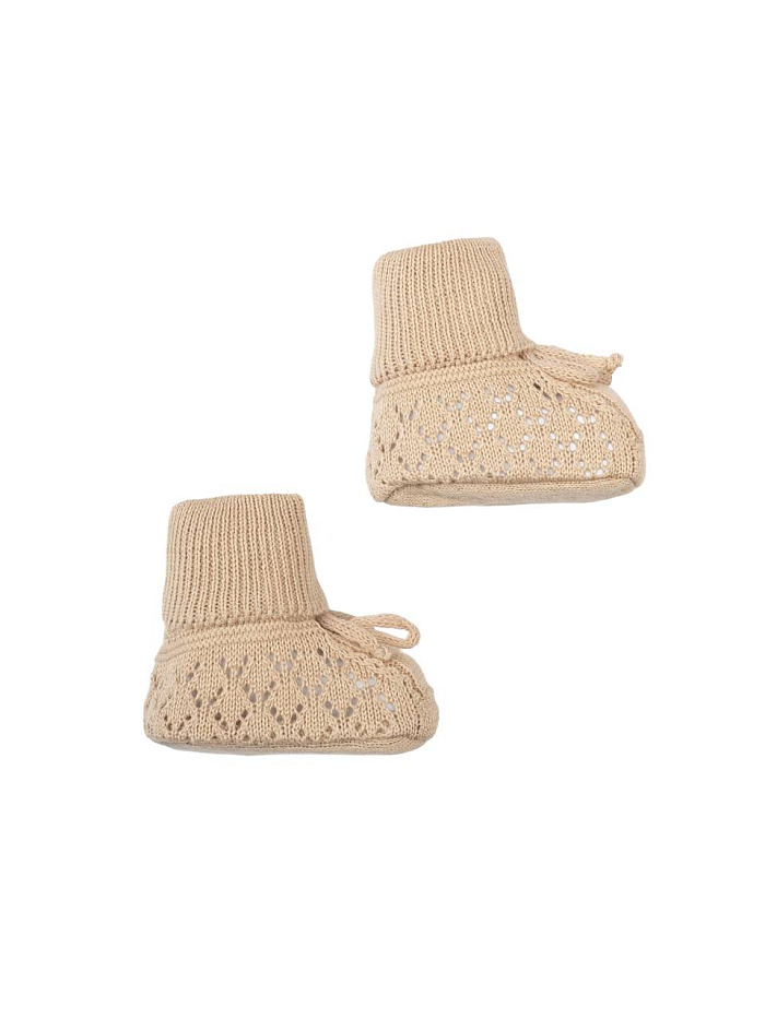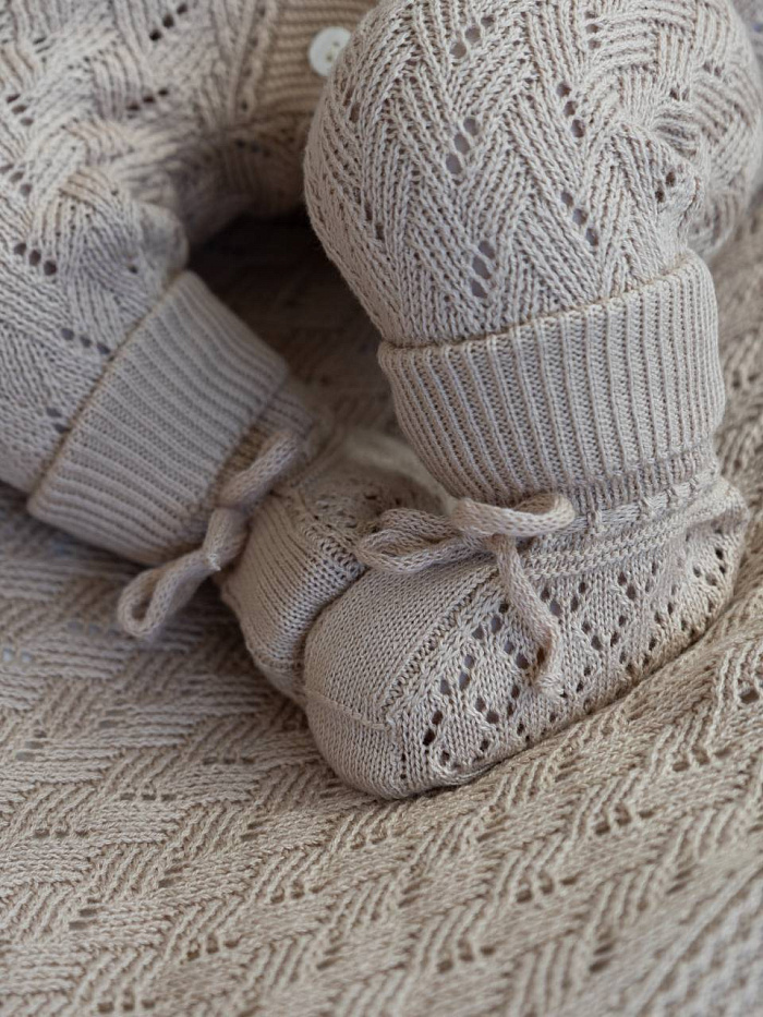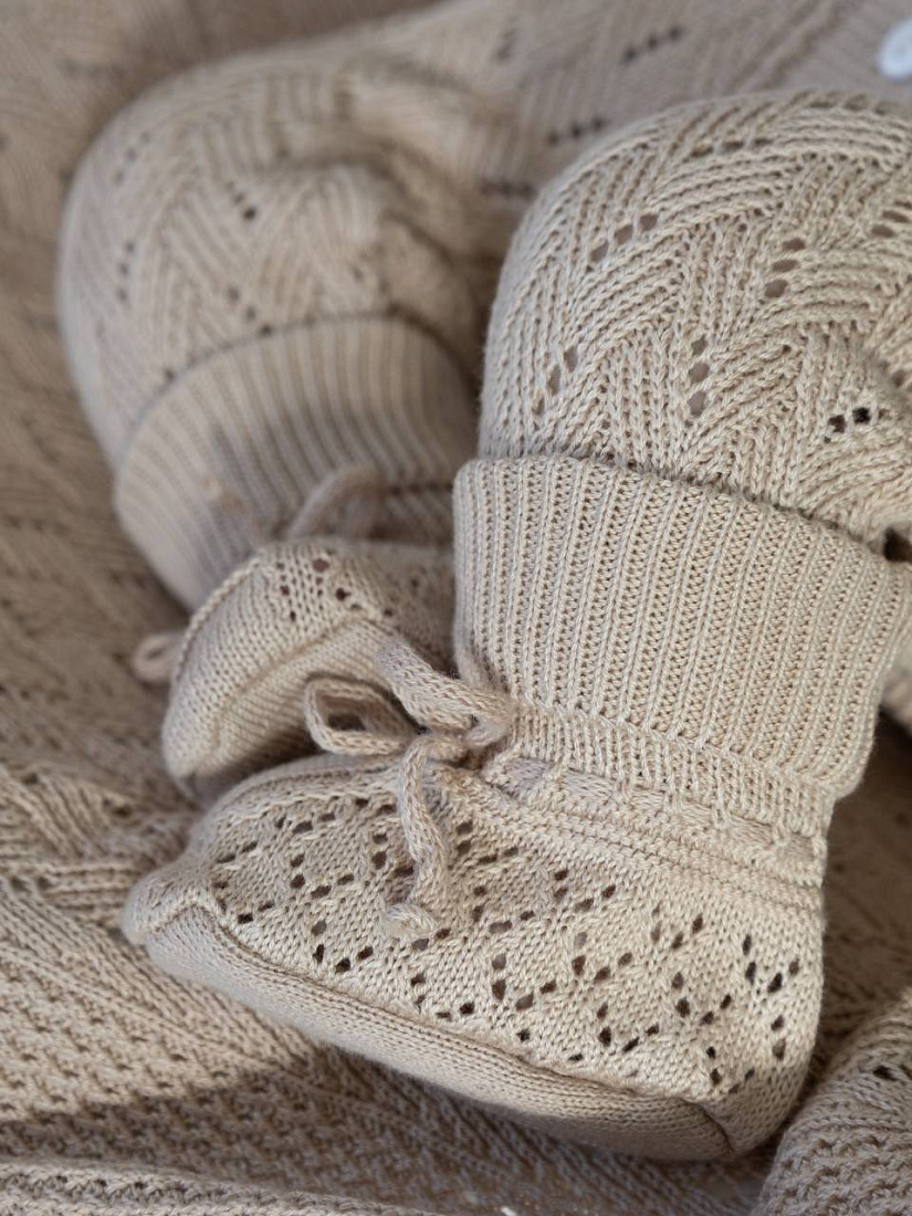 Вязаные носки для грудничков созданы с учетом нежной и чувствительной кожи малышей. Модель выполнена из мягкой пряжи, которая обеспечивает комфорт и приятные ощущения при носке. Основной цвет изделия — спокойный, универсальный, гармонично сочетающийся с разной детской одеждой. Вязаная структура изделия обладает аккуратным ажурным узором, который не только украшает носки, но и способствует циркуляции воздуха, предотвращая перегрев ножек. Высокая эластичная резинка хорошо фиксирует носки на ножке, не сдавливает и не оставляет следов, что особенно важно для грудничков. Текстура мягкая, без грубых швов и раздражающих элементов. Благодаря продуманной конструкции, носки удобно надевать и снимать, а также носить в течение длительного времени. Они подходят для ежедневного использования дома и на прогулке, обеспечивают тепло и уют даже в прохладную погоду. Классический дизайн и аккуратная отделка подчеркивают качество исполнения.
