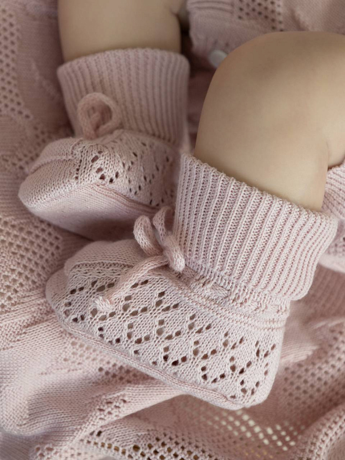 Вязаные носки для грудничков созданы с учетом нежной и чувствительной кожи малышей. Модель выполнена из мягкой пряжи, которая обеспечивает комфорт и приятные ощущения при носке. Основной цвет изделия — спокойный, универсальный, гармонично сочетающийся с разной детской одеждой. Вязаная структура изделия обладает аккуратным ажурным узором, который не только украшает носки, но и способствует циркуляции воздуха, предотвращая перегрев ножек. Высокая эластичная резинка хорошо фиксирует носки на ножке, не сдавливает и не оставляет следов, что особенно важно для грудничков. Текстура мягкая, без грубых швов и раздражающих элементов. Благодаря продуманной конструкции, носки удобно надевать и снимать, а также носить в течение длительного времени. Они подходят для ежедневного использования дома и на прогулке, обеспечивают тепло и уют даже в прохладную погоду. Классический дизайн и аккуратная отделка подчеркивают качество исполнения.