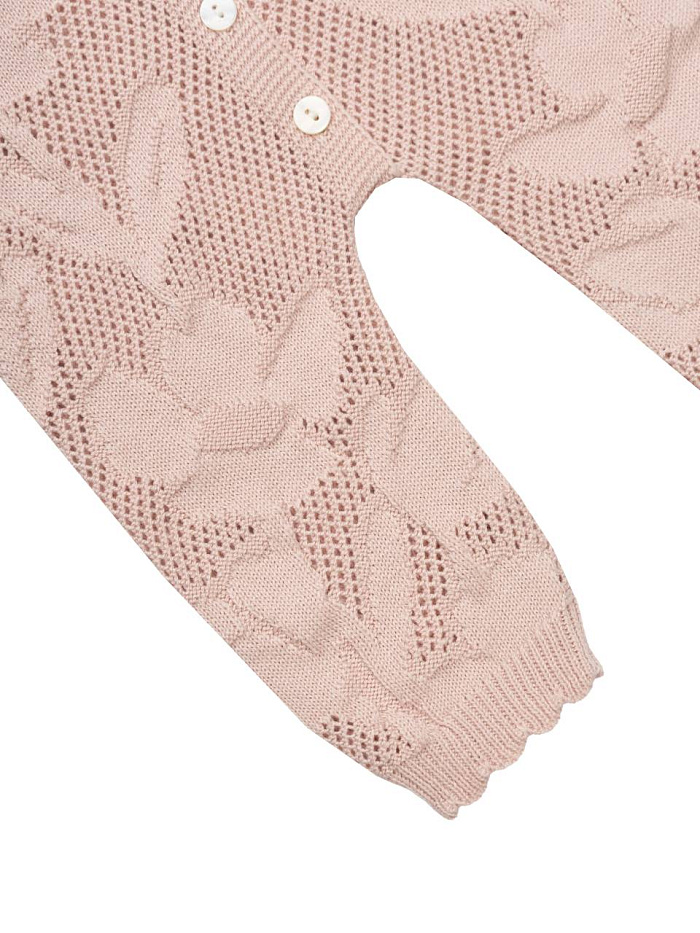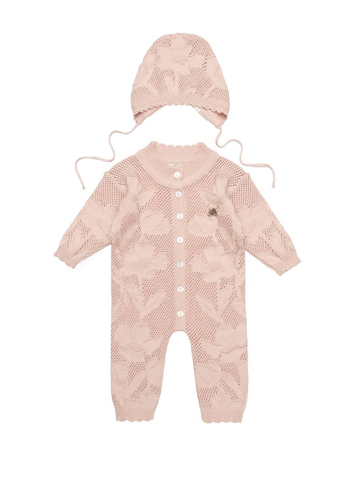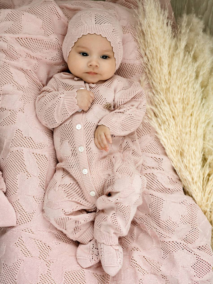 Комплект для малышей включает комбинезон и шапка, выполненные из 100% хлопок. Визуально изделие отличается нежным оттенком и ажурной текстурой с выразительным узором в виде крупных цветочных мотивов, напоминающих цветущие сады. Комбинезон имеет длинные рукава и ножки, застегивается по центру на удобные кнопки, что облегчает переодевание. Эластичные манжеты на рукавах и ножках обеспечивают комфортную посадку и удерживают тепло. Шапка выполнена в едином стиле с комбинезоном, украшена тем же ажурным цветочным узором и оснащена мягкими завязками, которые надежно фиксируют изделие на голове ребенка. Оба элемента комплекта имеют аккуратные края с волнистой отделкой, что придает изделию дополнительную декоративность. Материал – натуральный хлопок, который отличается мягкостью, гипоаллергенностью и позволяет коже малыша свободно дышать, обеспечивая комфорт в течение всего дня.