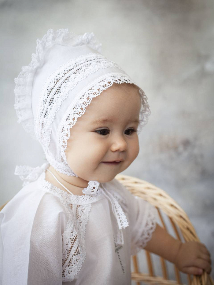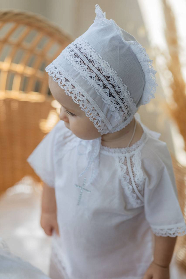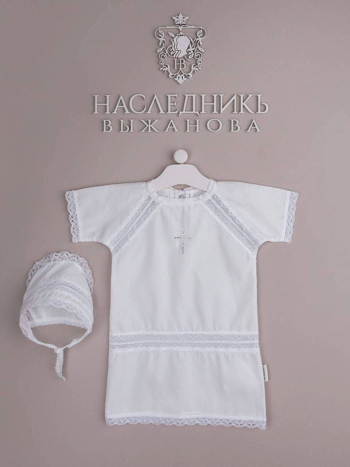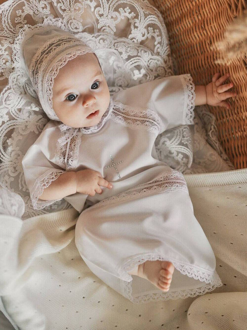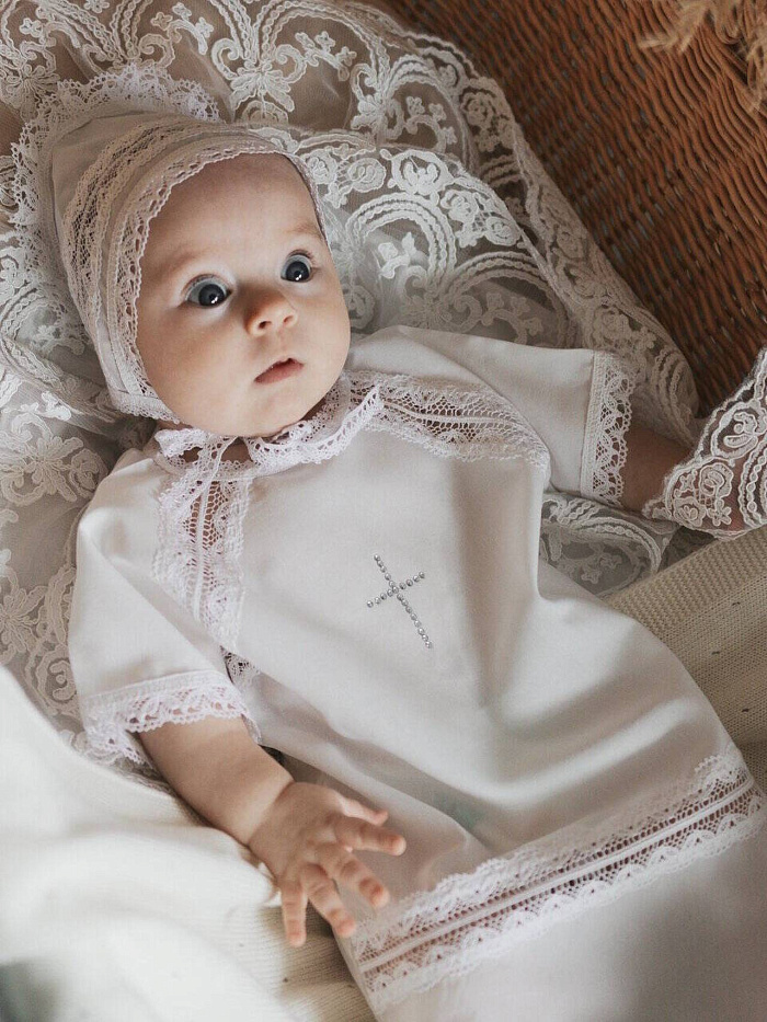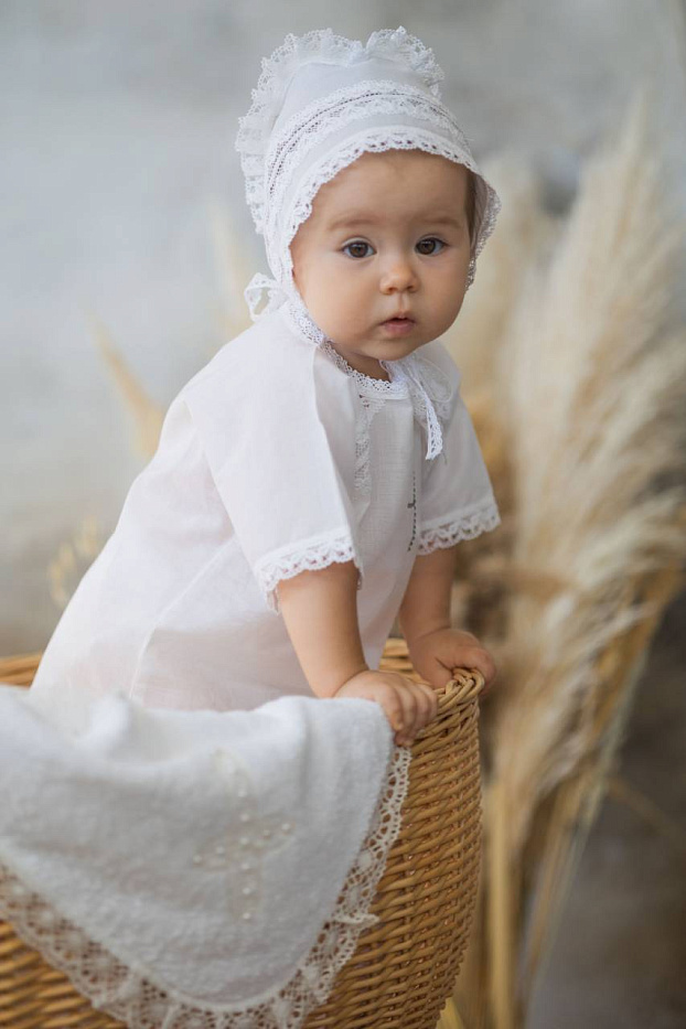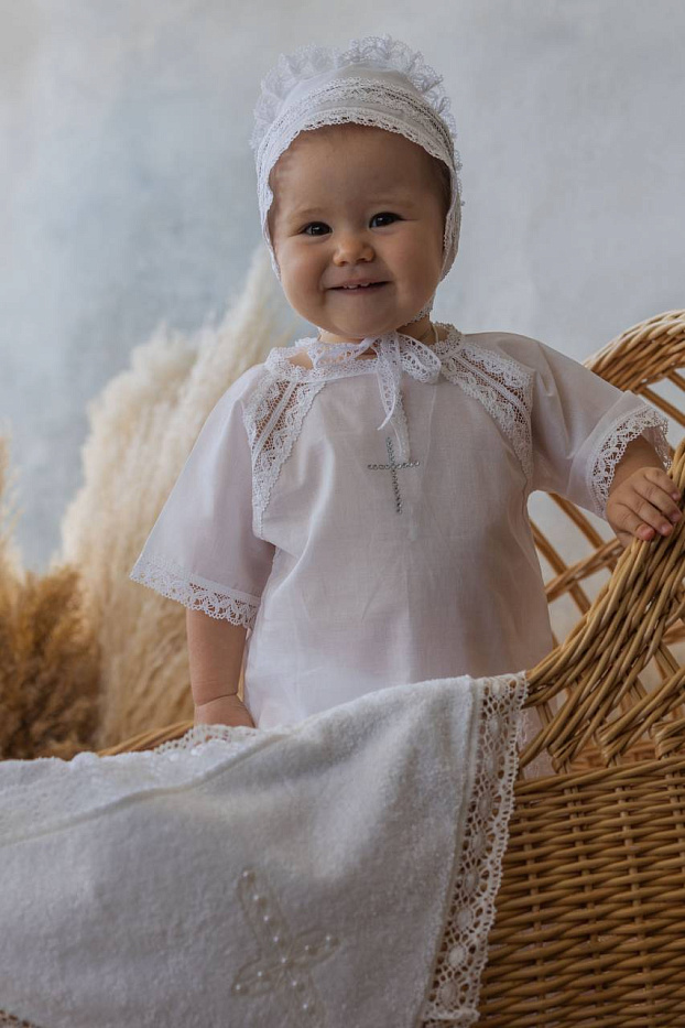 Роскошный крестильный комплект выполнен из 100% нежнейшего хлопка. Оформлен красивым белым кружевом и крестиком из страз на груди. Сзади на удобных завязках.