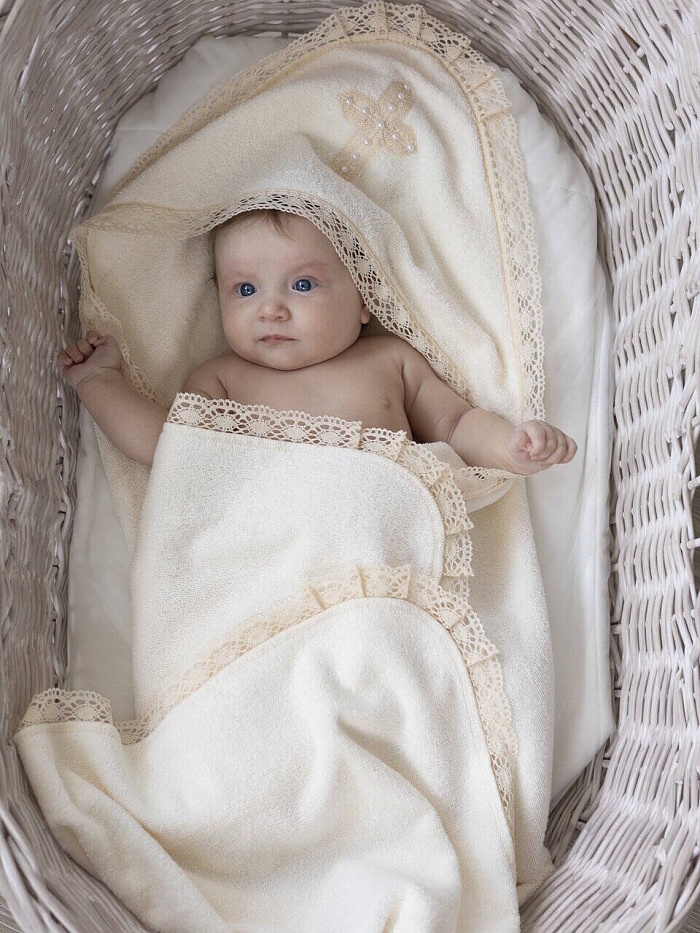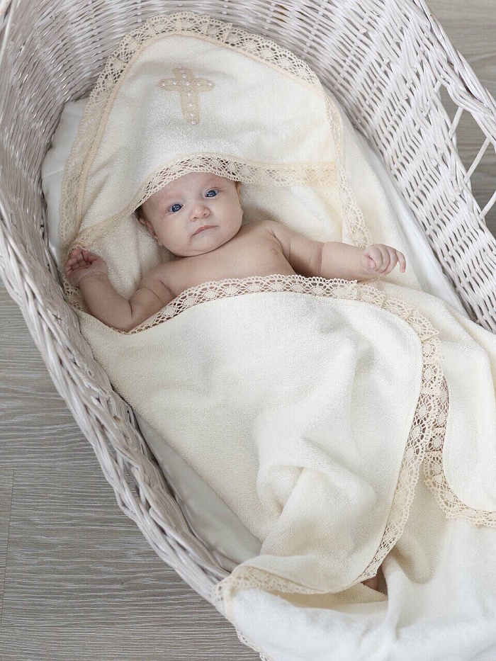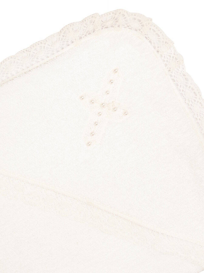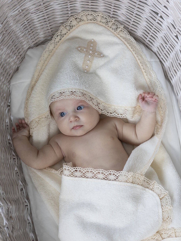 Роскошное полотенце с уголком для крещения выполнено из махрового полотна (100% хлопок). Отделка из изящного кружева. Капюшон-уголок украшен крестиком из кружева с жемчужинками.